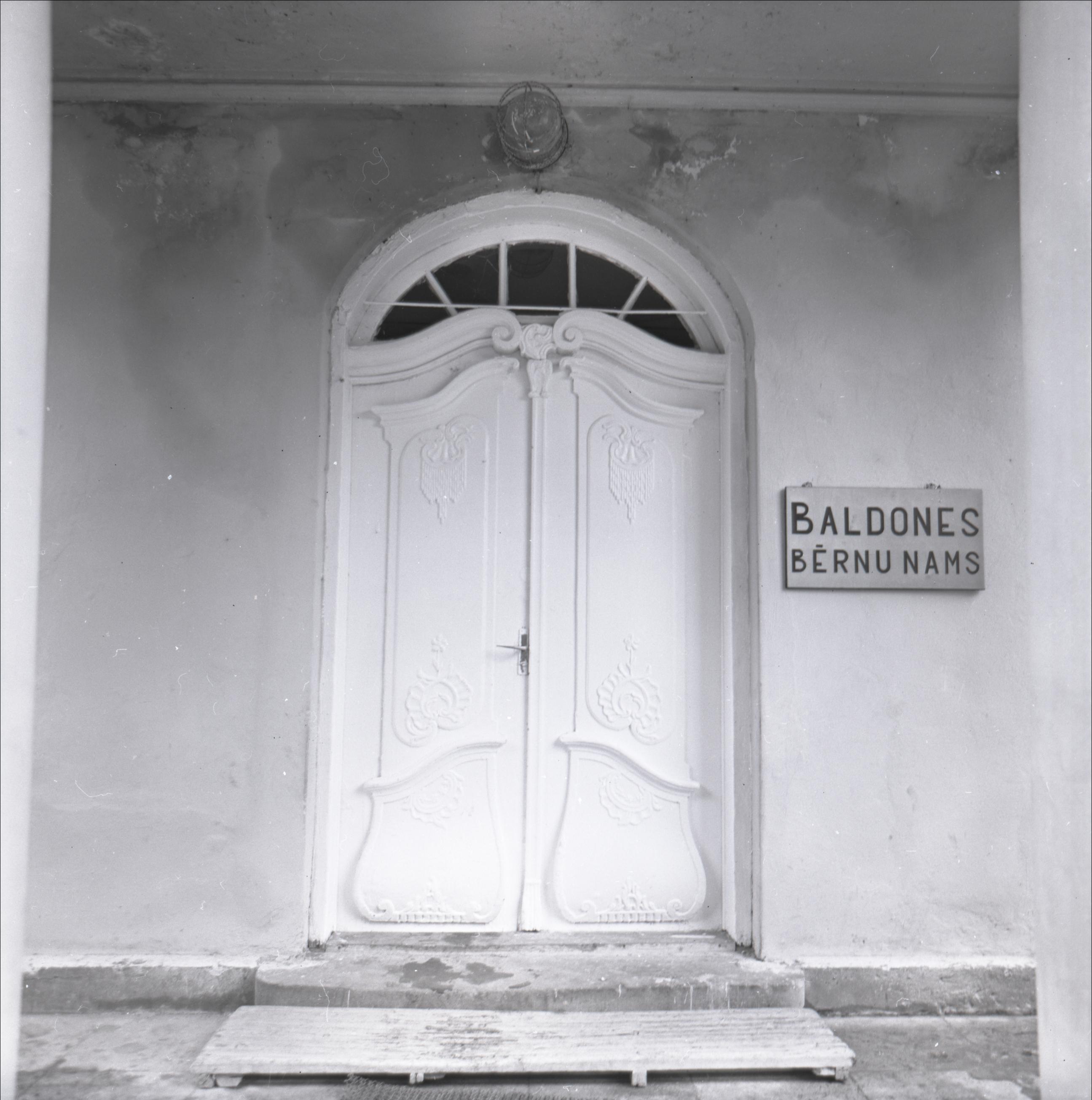 Mercendarbes muižas apbūve: Durvis. Pa labi no durvīm plāksne ar uzrakstu "Baldones bērnu nams"