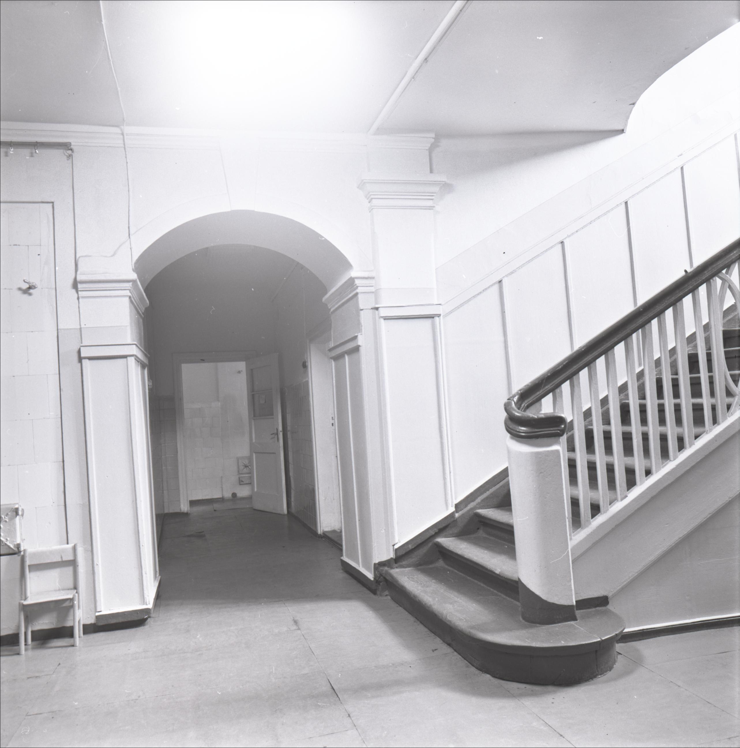 Mercendarbes muižas apbūve: Interjers. Labajā pusē kāpnes, kas ved uz otro stāvu, attēla vidū redzama pusaploces arka, kas norobežo telpas. Tālumā durvis un krāsns.