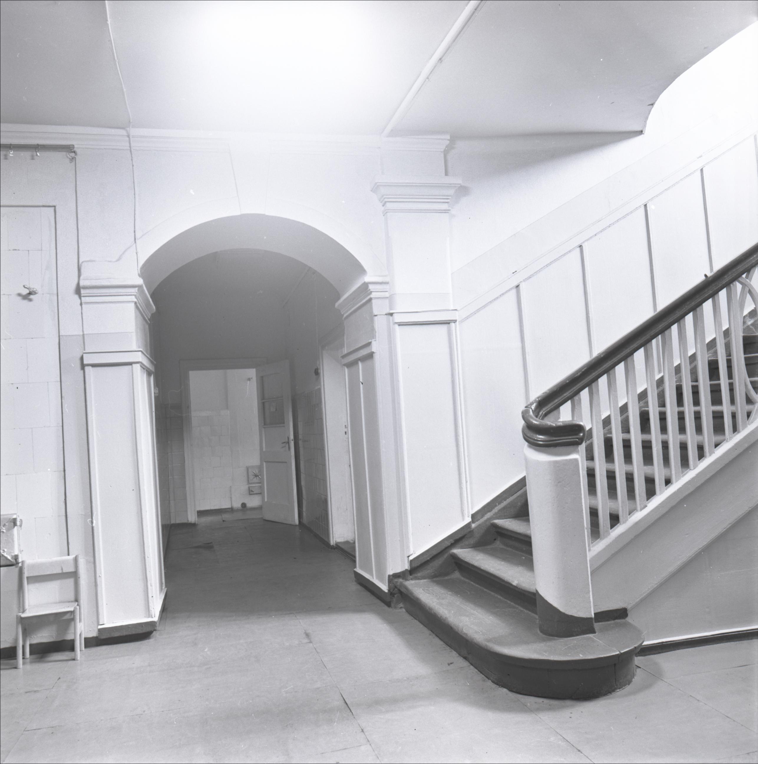 Mercendarbes muižas apbūve: Interjers. Labajā pusē kāpnes, kas ved uz otro stāvu, attēla vidū redzama pusaploces arka, kas norobežo telpas. Tālumā durvis un krāsns.