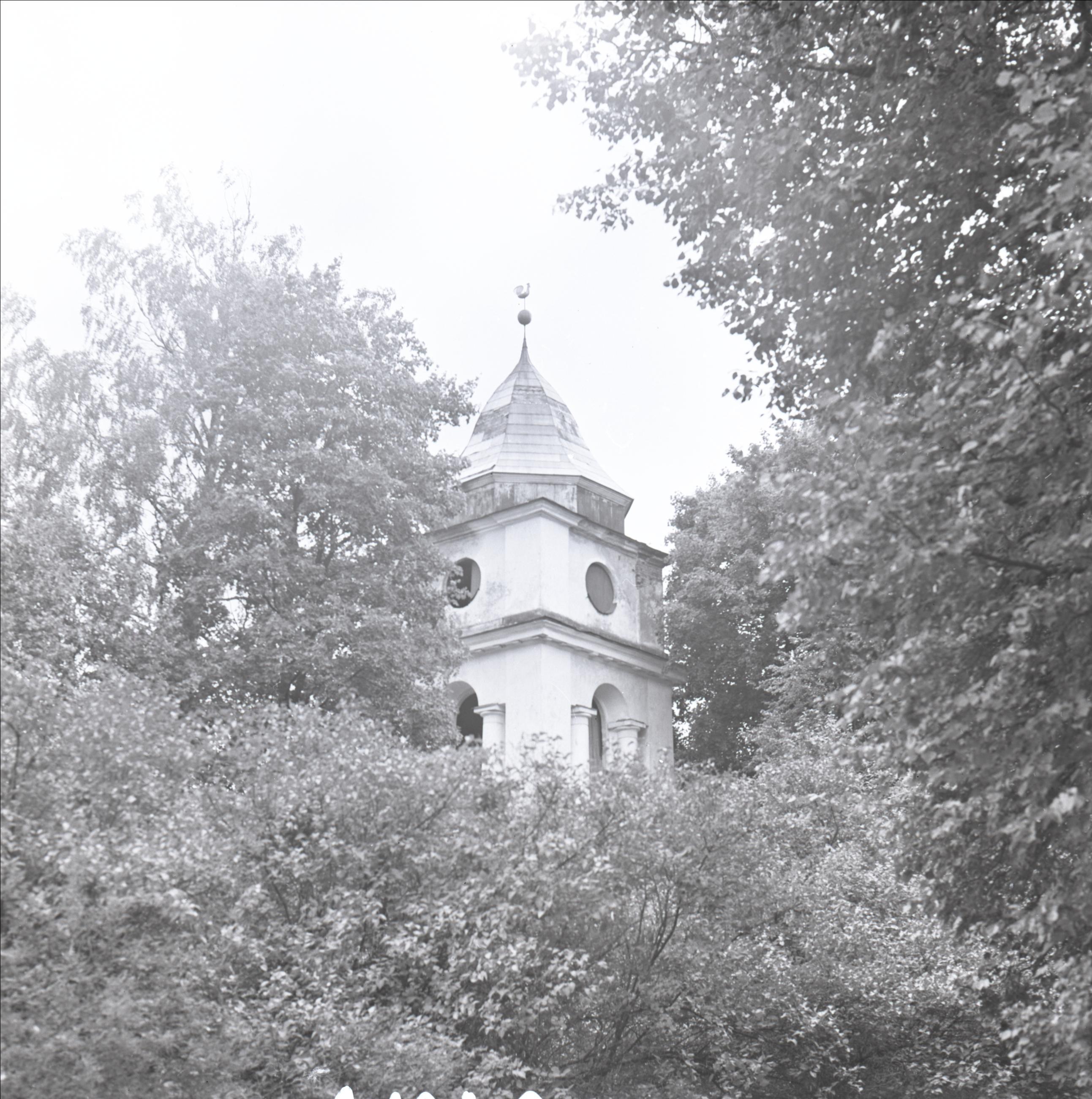 Baldones luterāņu baznīca: Baznīcas tornis. Torņa galā vējrādītājs gaiļa formā. Tornis redzams caur koku lapotnēm.