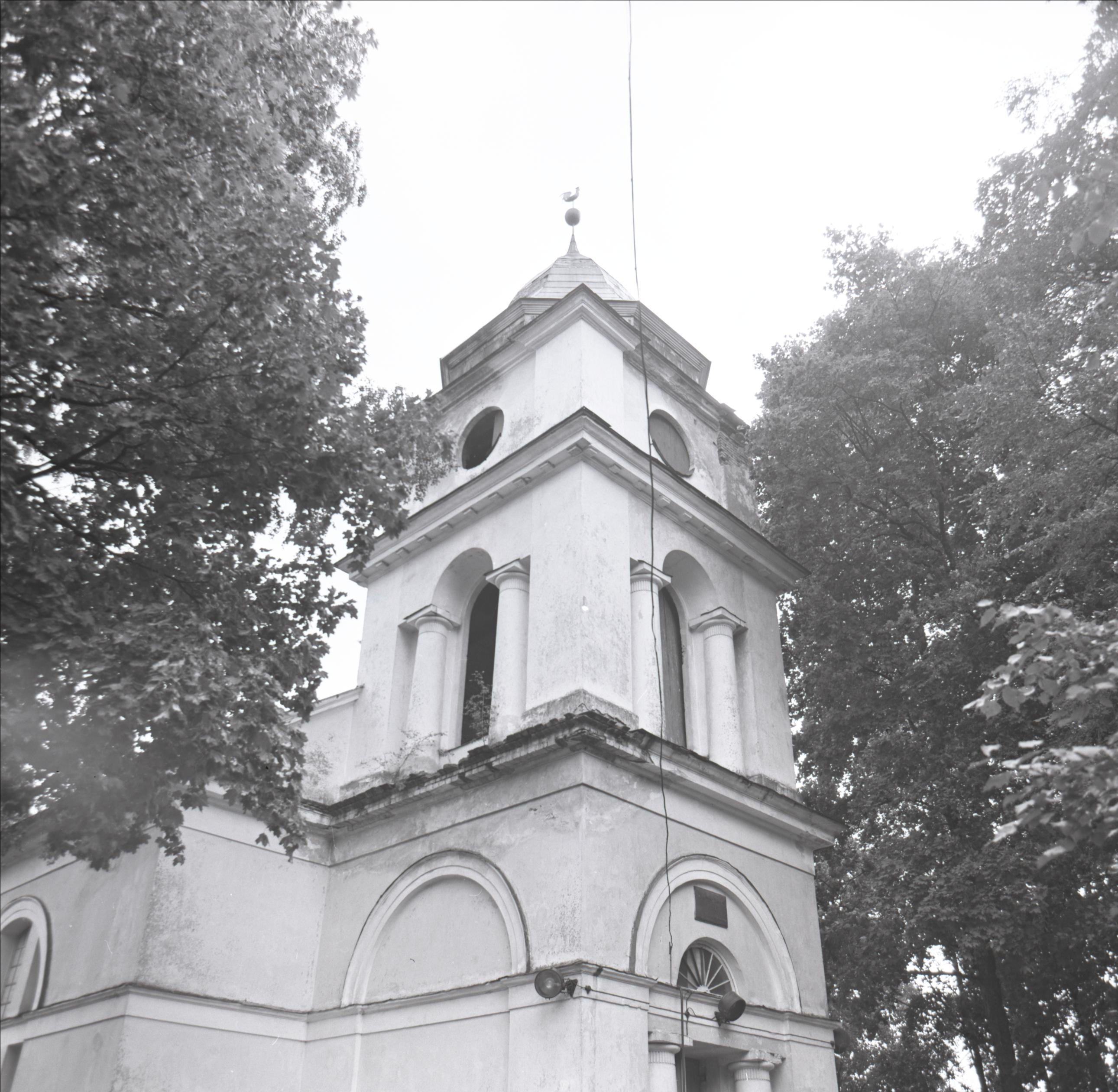 Baldones luterāņu baznīca: Baznīcas tornis. Torņa galā vējrādītājs gaiļa formā. Abpus tornim koku lapotnes.