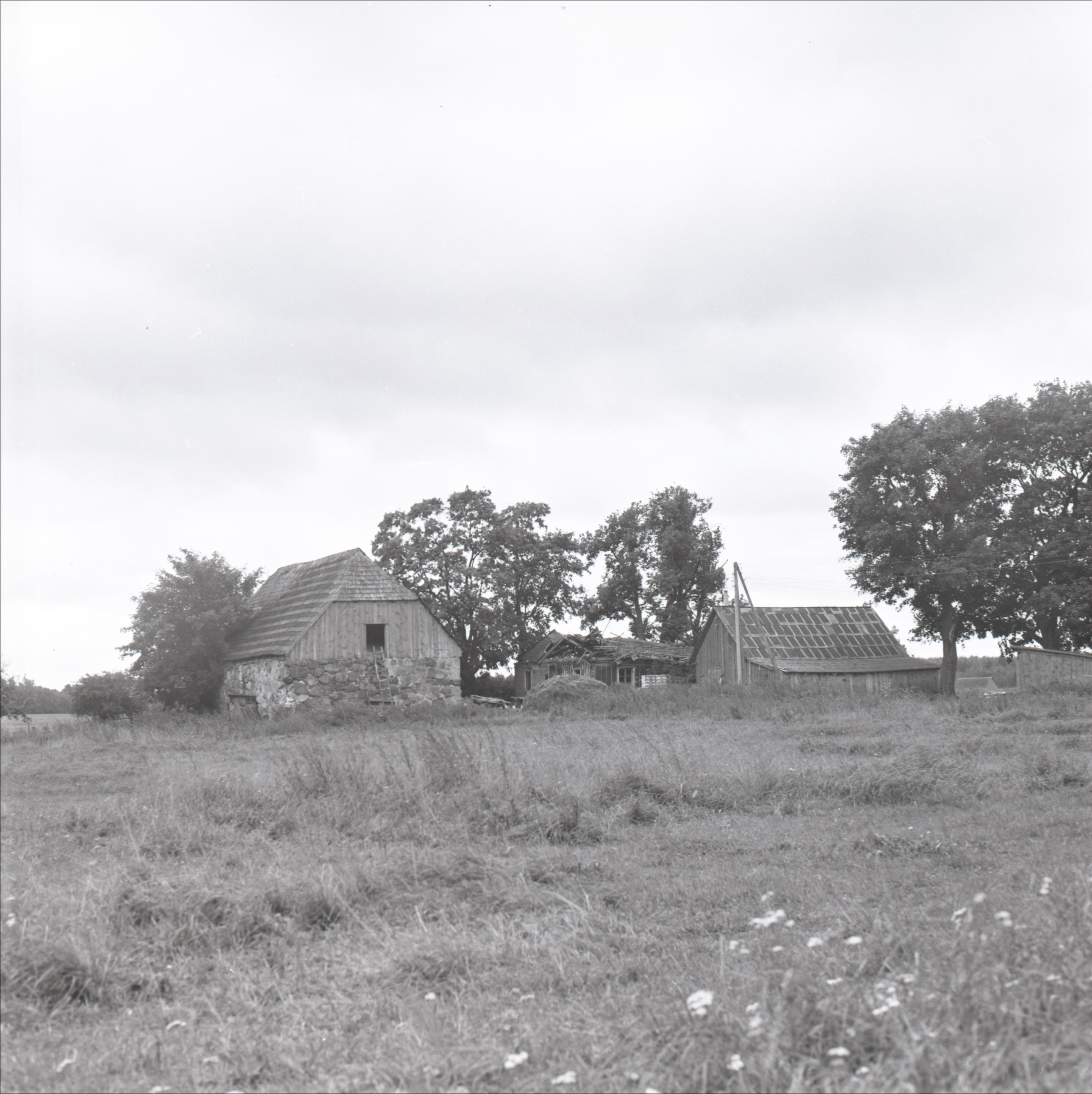 Ēkas: Skats uz ēkām no attāluma. Labajā pusē redzama koka saimniecības ēka ar šīfera jumtu. Kreisajā pusē akmens mūrējuma ēka ar divslīpju lubiņu jumtu ar pusšļauptiem galiem. Vidū redzama daļēji sabrukusi ēka. Apkārt ēkām koki.
