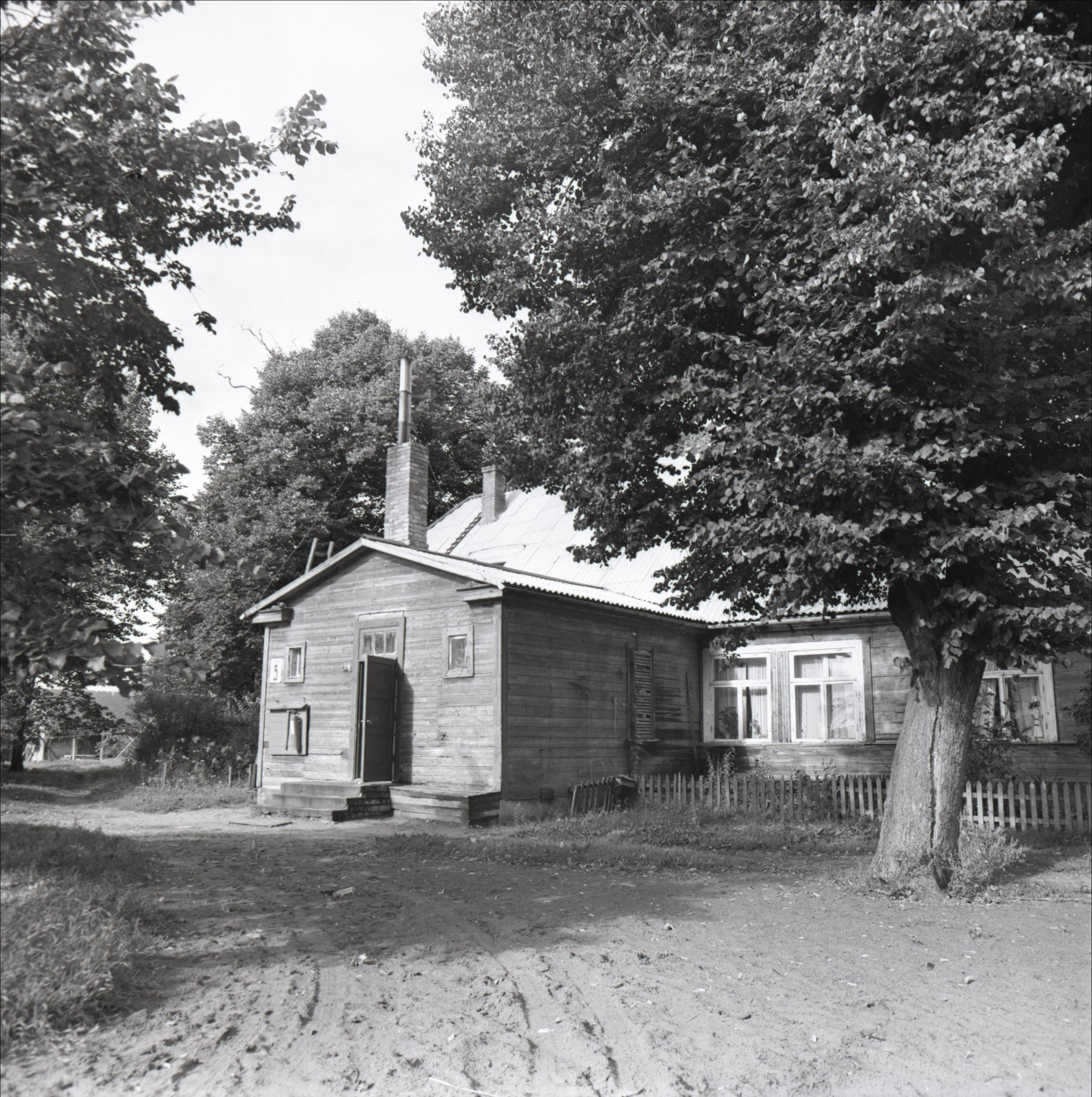 Ēka: Skats uz lieveni pie ēkas galvenās fasādes no labās puses. Ieejas durvis atvērtas. Skatu uz pārējo ēku labajā pusē aizsedz koks. Fonā koki.