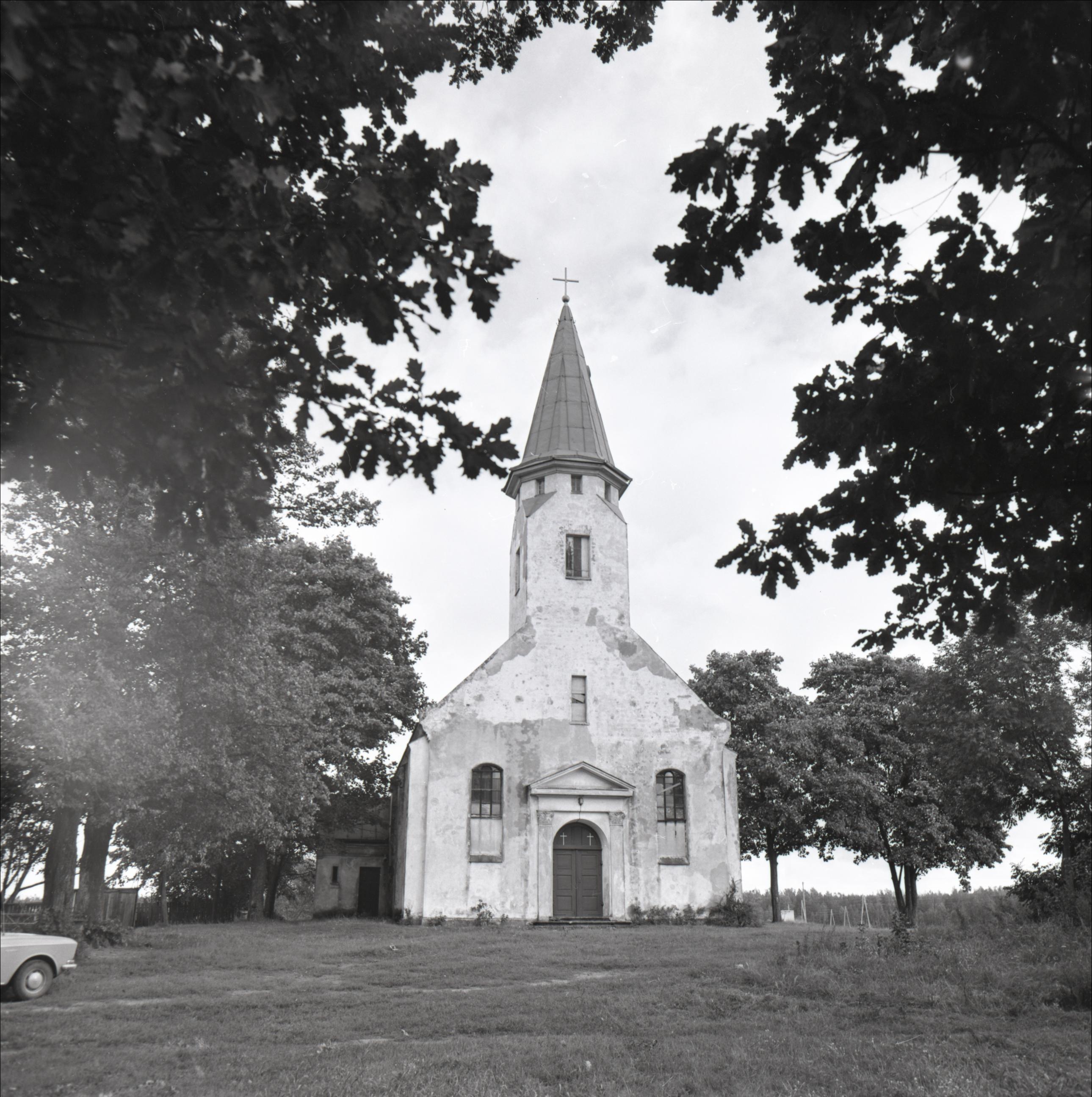 Olaines luterāņu baznīca: Galvenās ieejas fasāde. Durvis pusaploces arkas formā. Virs dirvīm trīsstūrveida timpanons. Galvenā fasāde apvienota ar torni. Torņa galā krusts. Abpus baznīcai koki.