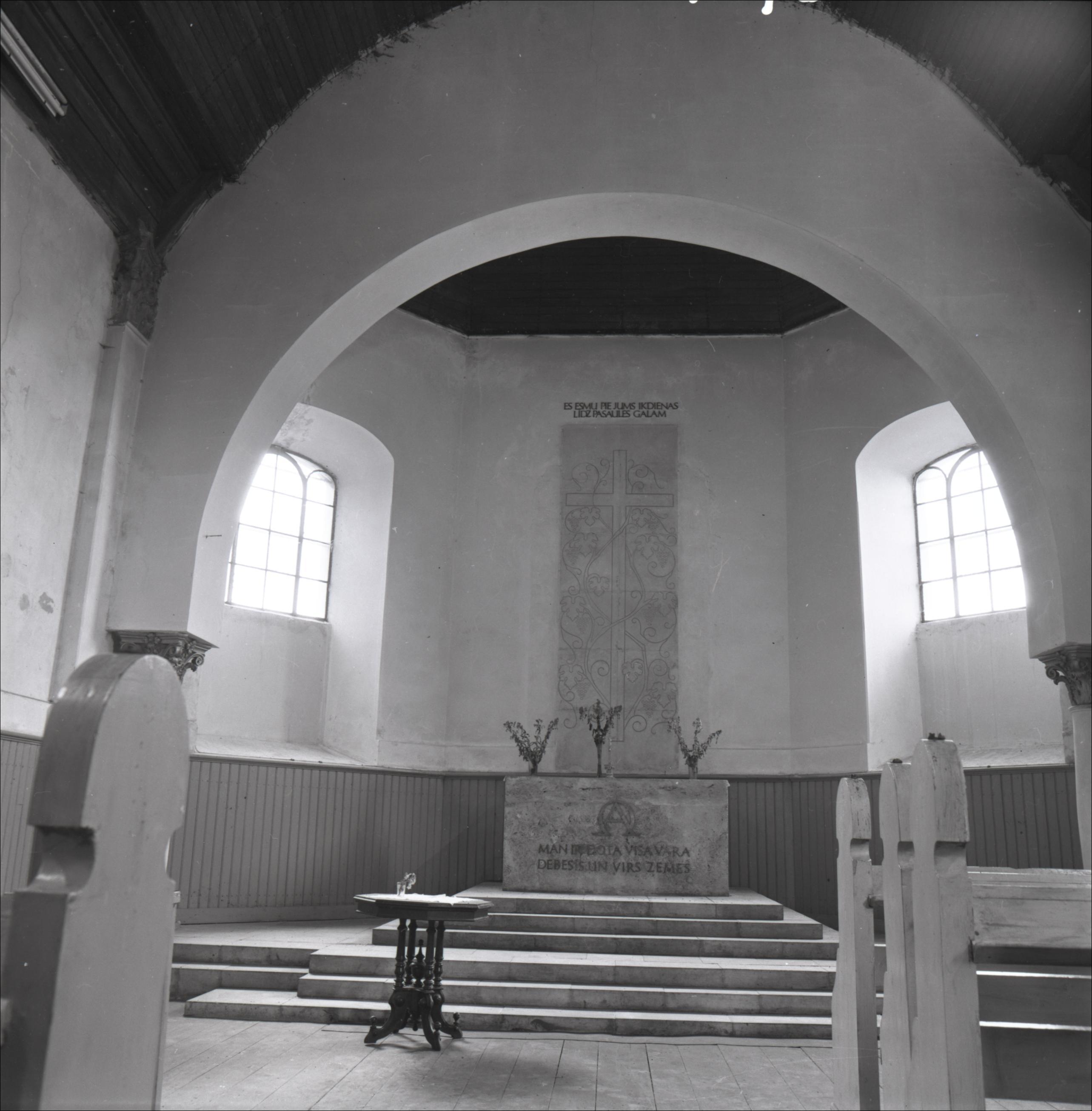 Olaines luterāņu baznīca: Skats uz altāri. Altāra daļu no pārējās baznīcas atdalīta ar pusaploces arku. Altāra daļā divi logi. Uz altāri ved pakāpieni, altārgleznas vietā zīmēts krusts.