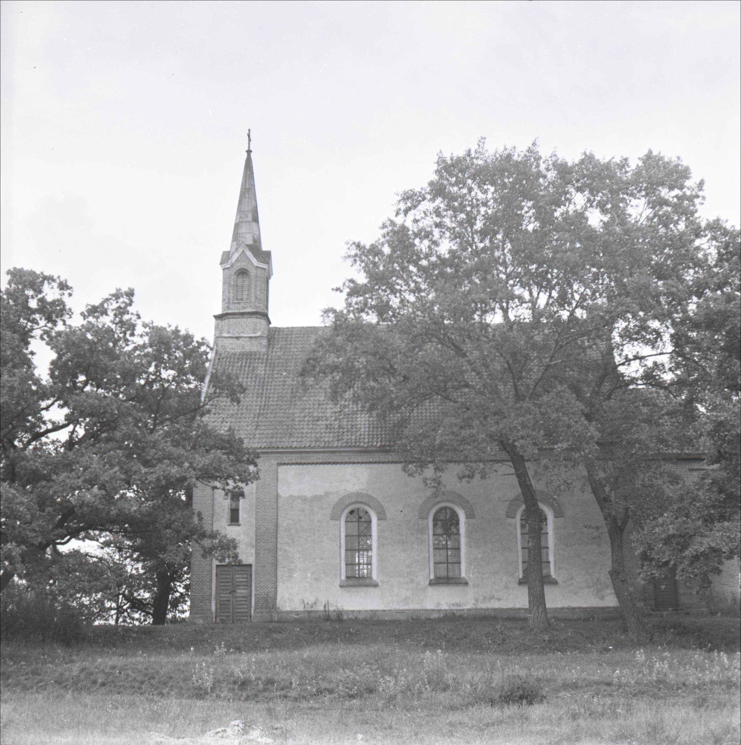 Piņķu Sv. Annas luterāņu baznīca: Skats uz baznīcas sānu fasādi. Sānu fasādes kreisajā pusē koka durvis. Kreisajā pusē arī paceļas tornis, toņa galā krusts. Sānu fasādes logi pusaploces arkas formā. Apkārt baznīcai koki.