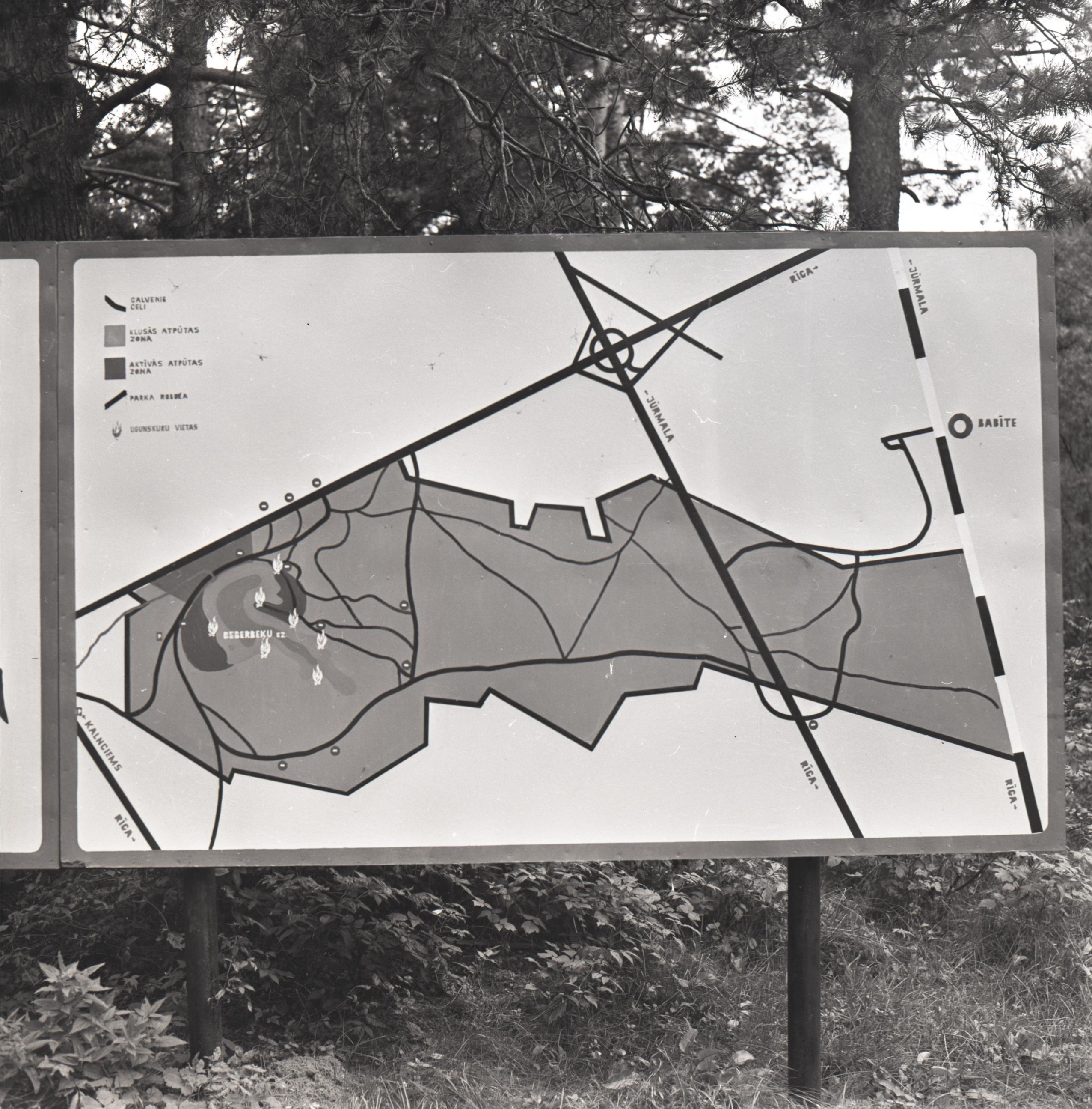 Beberbeķu dabas parks: Stends ar dabas parka plānu. Fonā koki.