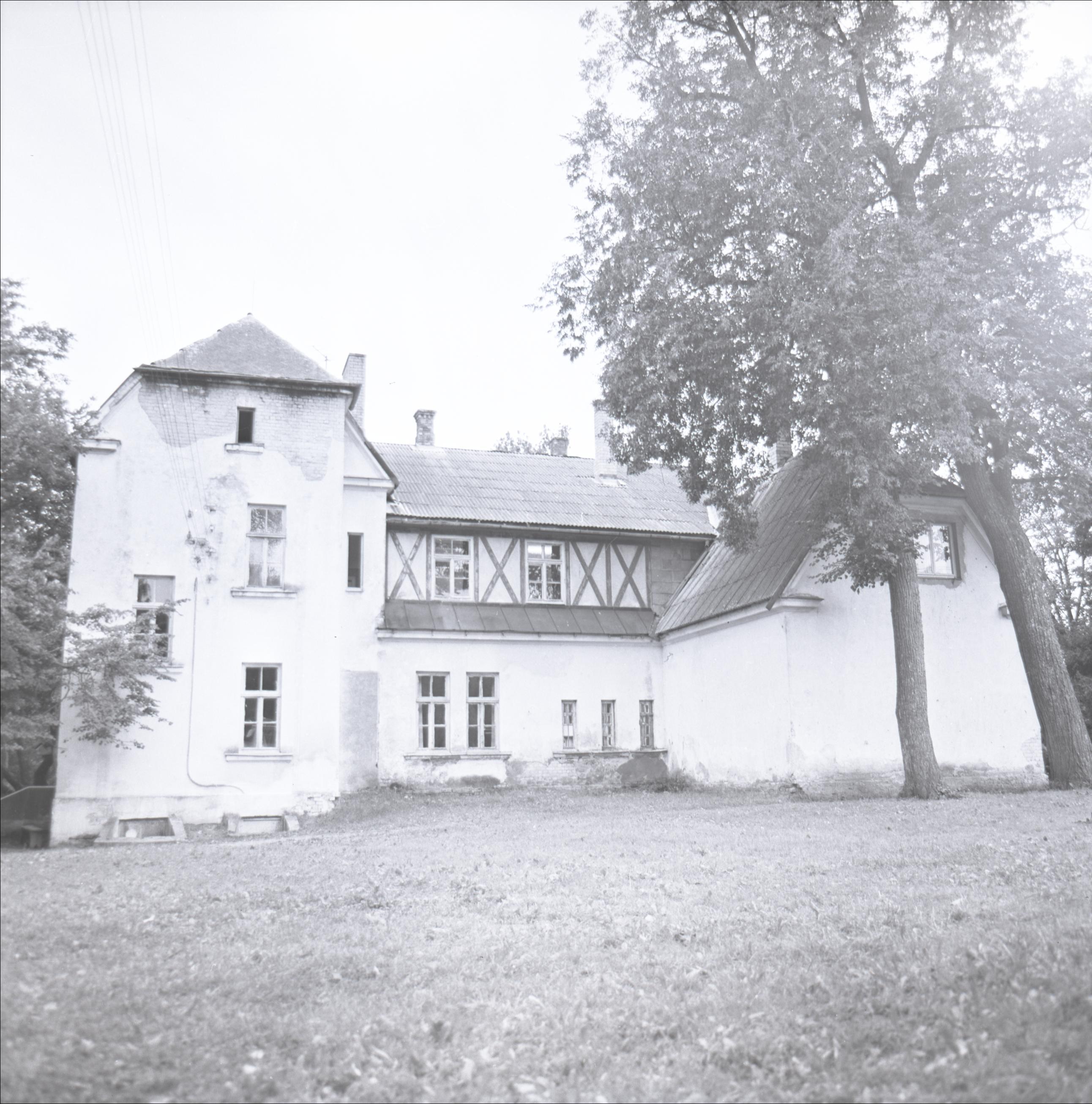 Piņķu mācītājmuiža: Ārskats. Daudzstāvu ēka ar vairākiem spārniem un fasādēm. Abiem spārniem divslīpju jumti ar pusšļauptiem galiem. Attēla labajā pusē skatu uz ēku daļēji aizsedz koki.