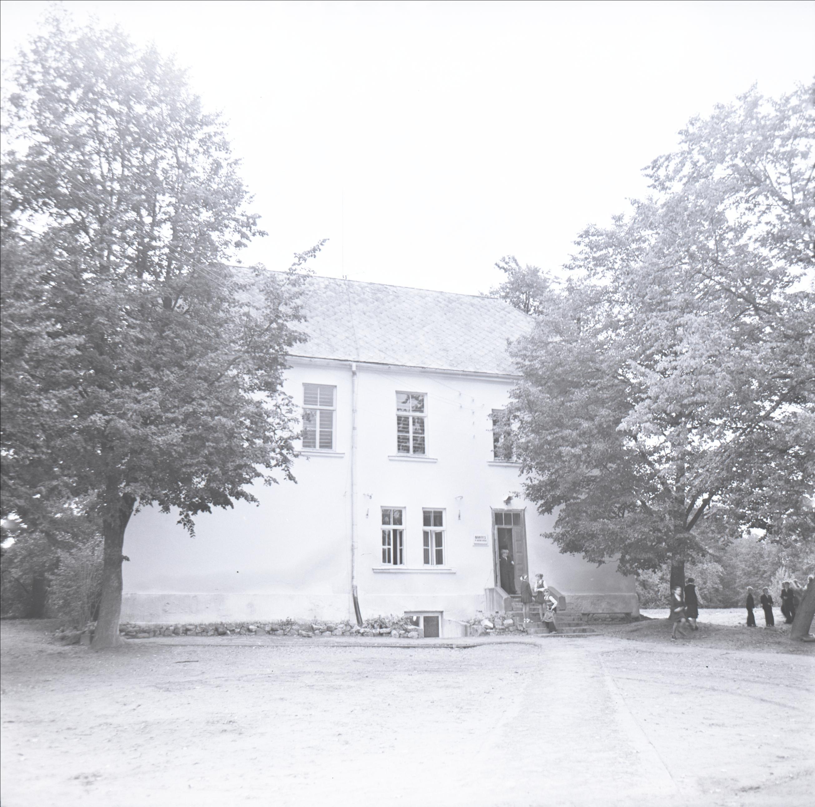 Piņķu mācītājmuiža: Skats uz ēkas ieeju, ēkai divi stāvi, abpus ēkai koki. Uz ieeju ved pakāpieni. Tālumā un pie ieejas redzami cilvēki.
