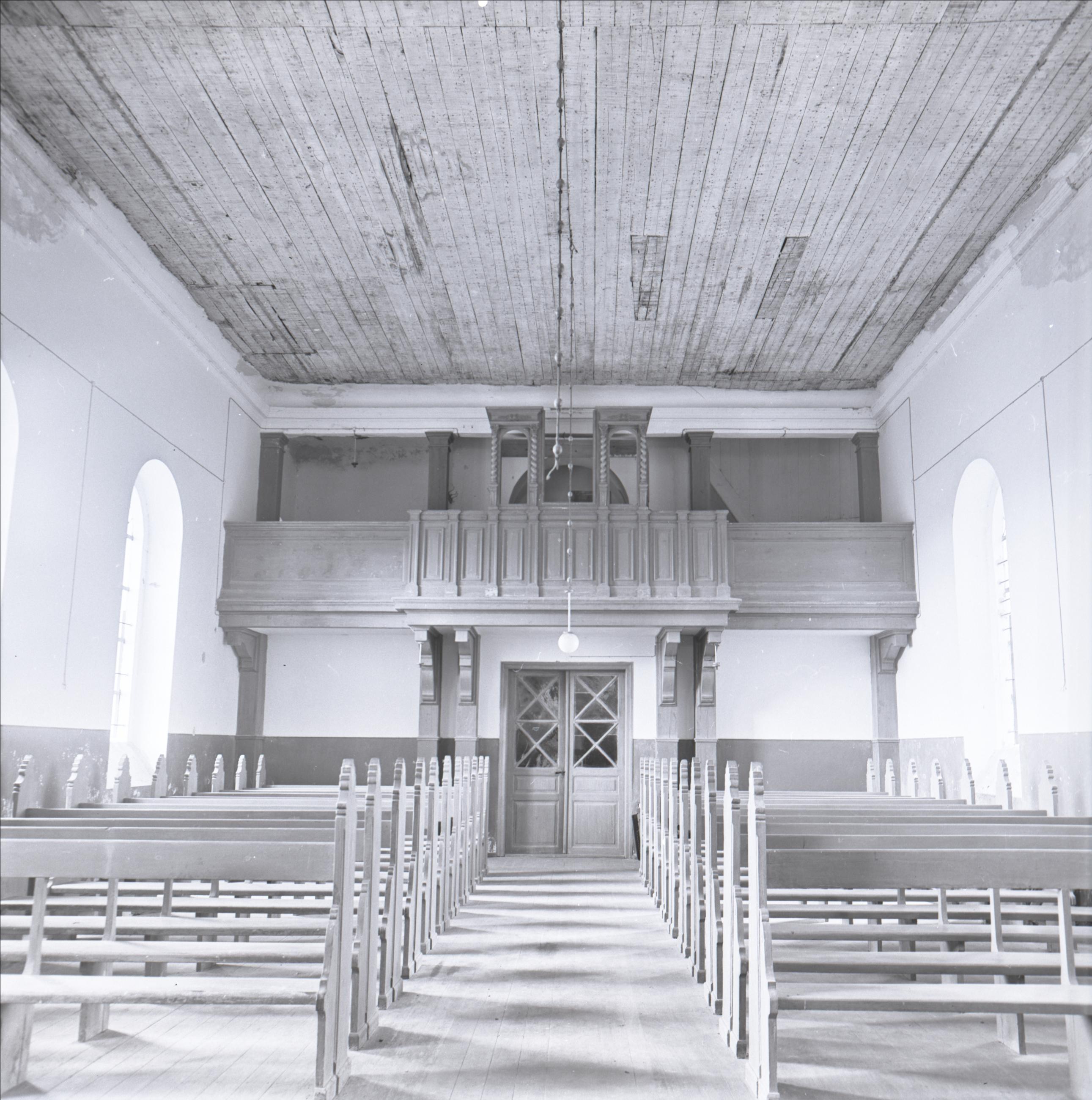 Piņķu Sv. Annas luterāņu baznīca: Skats uz ērģelēm uz balkona. Taisni koka dēļu griesti. Baznīcas koka soli divās rindās.