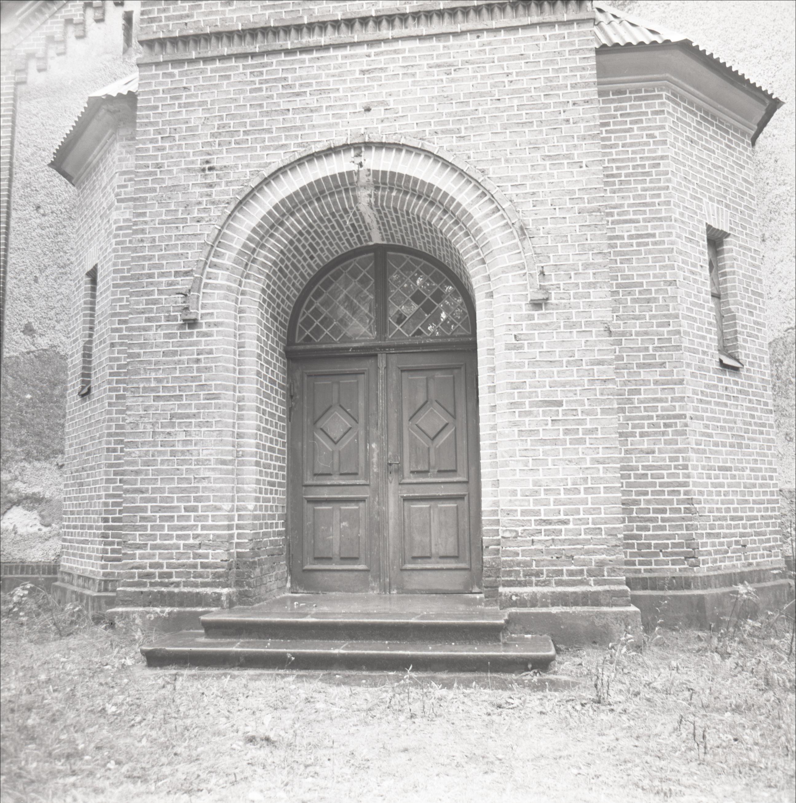 Salas Sv. Jāņa luterāņu baznīca: Baznīcas durvis. Tuvplāns. Durvju aila pusaploces formā. Virs durvīm logs, kas sadalīts smalkās rūtīs – vitrāžās.