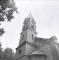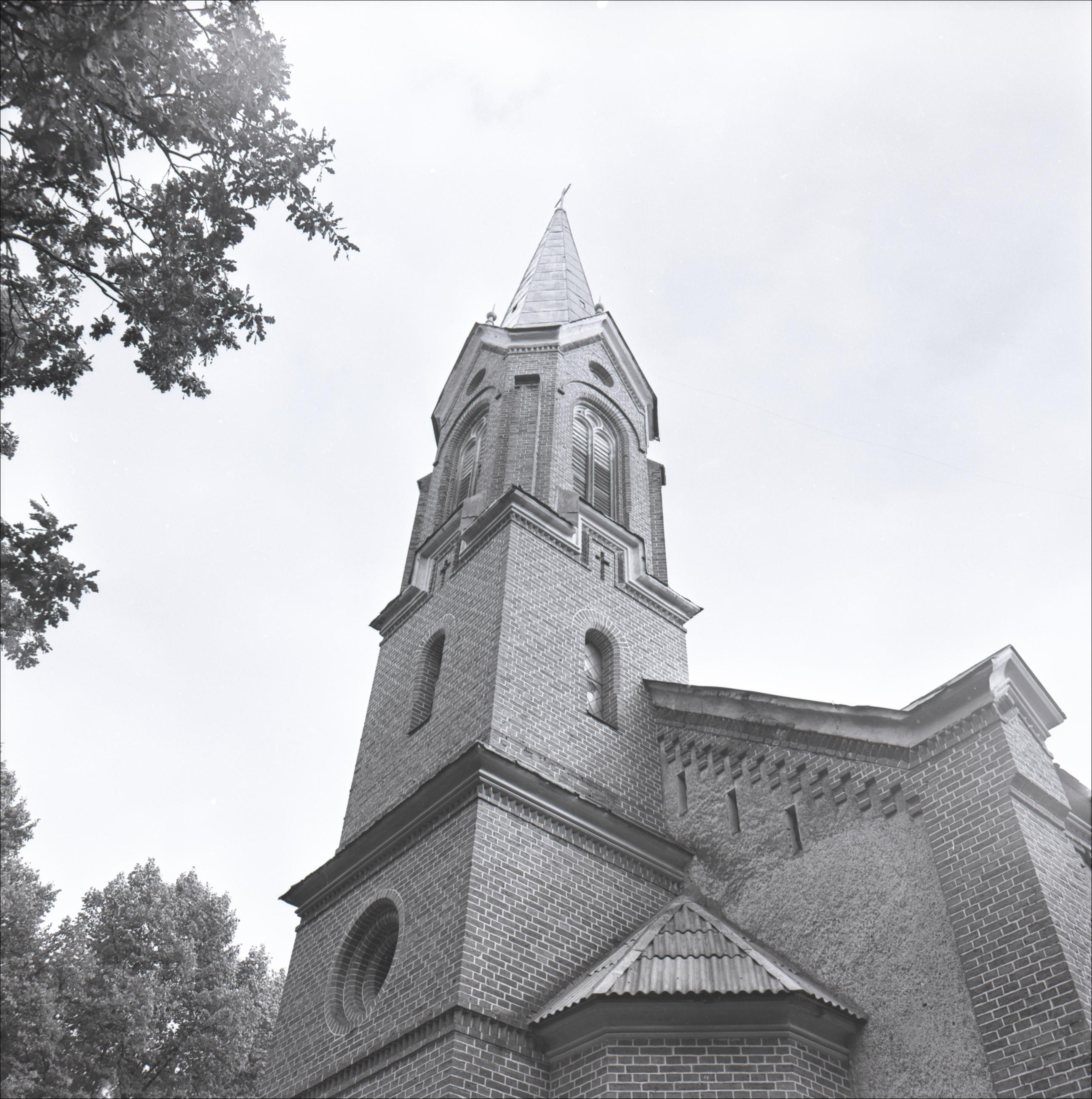 Salas Sv. Jāņa luterāņu baznīca: Baznīcas tornis, skats uz torni no apakšas. Torņa augšējā daļā logi pusaploces formā. Torņa galā krusts.