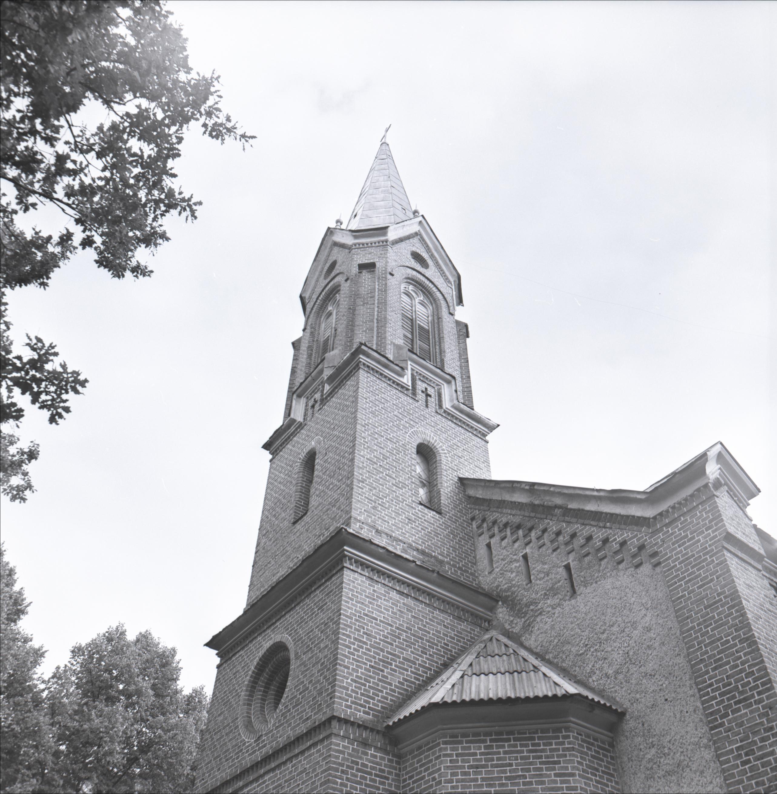 Salas Sv. Jāņa luterāņu baznīca: Baznīcas tornis, skats uz torni no apakšas. Torņa augšējā daļā logi pusaploces formā. Torņa galā krusts.