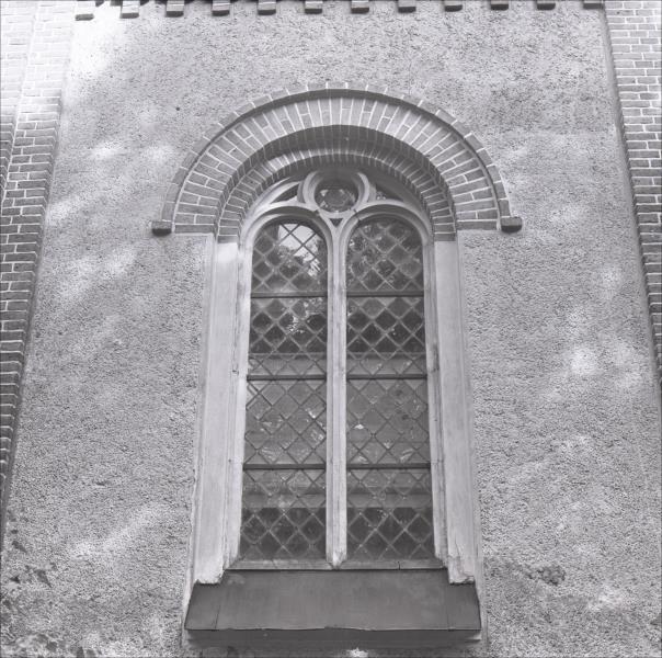 Salas Sv. Jāņa luterāņu baznīca: Sānu fasādes logs. Logs pusaploces arkas formā. Logiem sīks rūtojums, augšējā daļā rūtojums veido sešstaru zvaigzni.