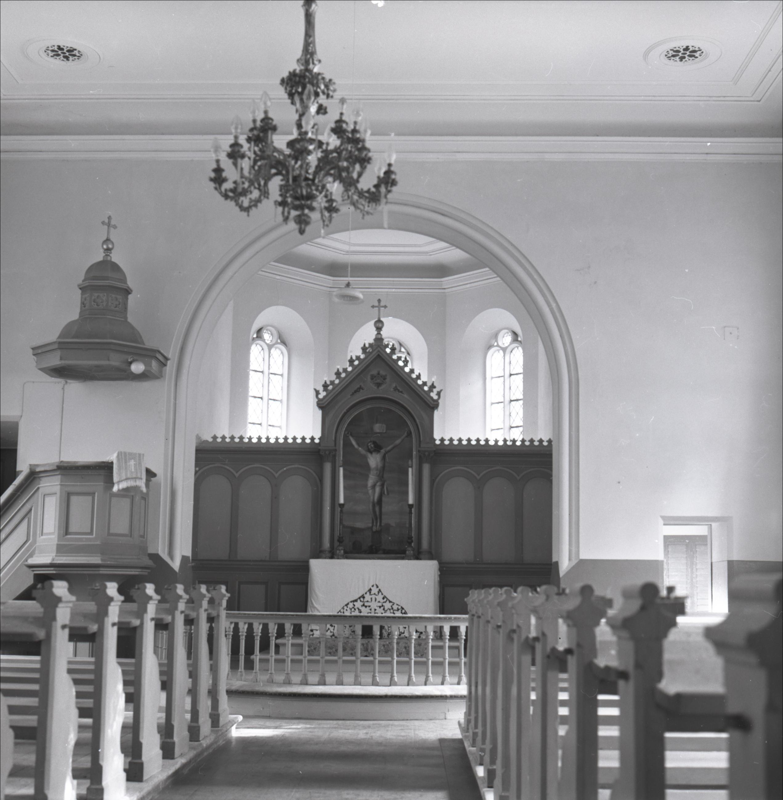 Salas Sv. Jāņa luterāņu baznīca: Skats uz altāri. Altāra daļa no pārējās baznīcas atdalīta ar pusaploces arku. Altāra daļā trīs logi pusaploces arkas formā. Altāra priekšā balustrāde. Koka altāris ar dekoratīviem kokgriezumiem, vidū glezna ar Jēzu pie krusta. Pa kreisi no altāra pie arkas atrodas kancele. Attēla augšplānā redzama griestu lustra.