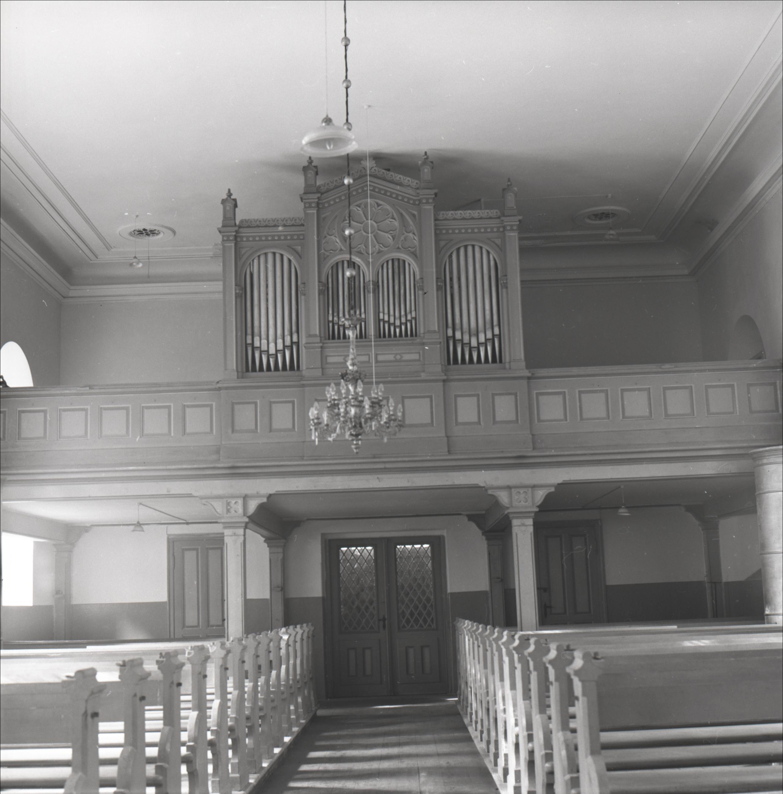 Salas Sv. Jāņa luterāņu baznīca: Skats uz ērģelēm uz balkona. Baznīcas koka soli divās rindās. No griestiem karājas lustra.