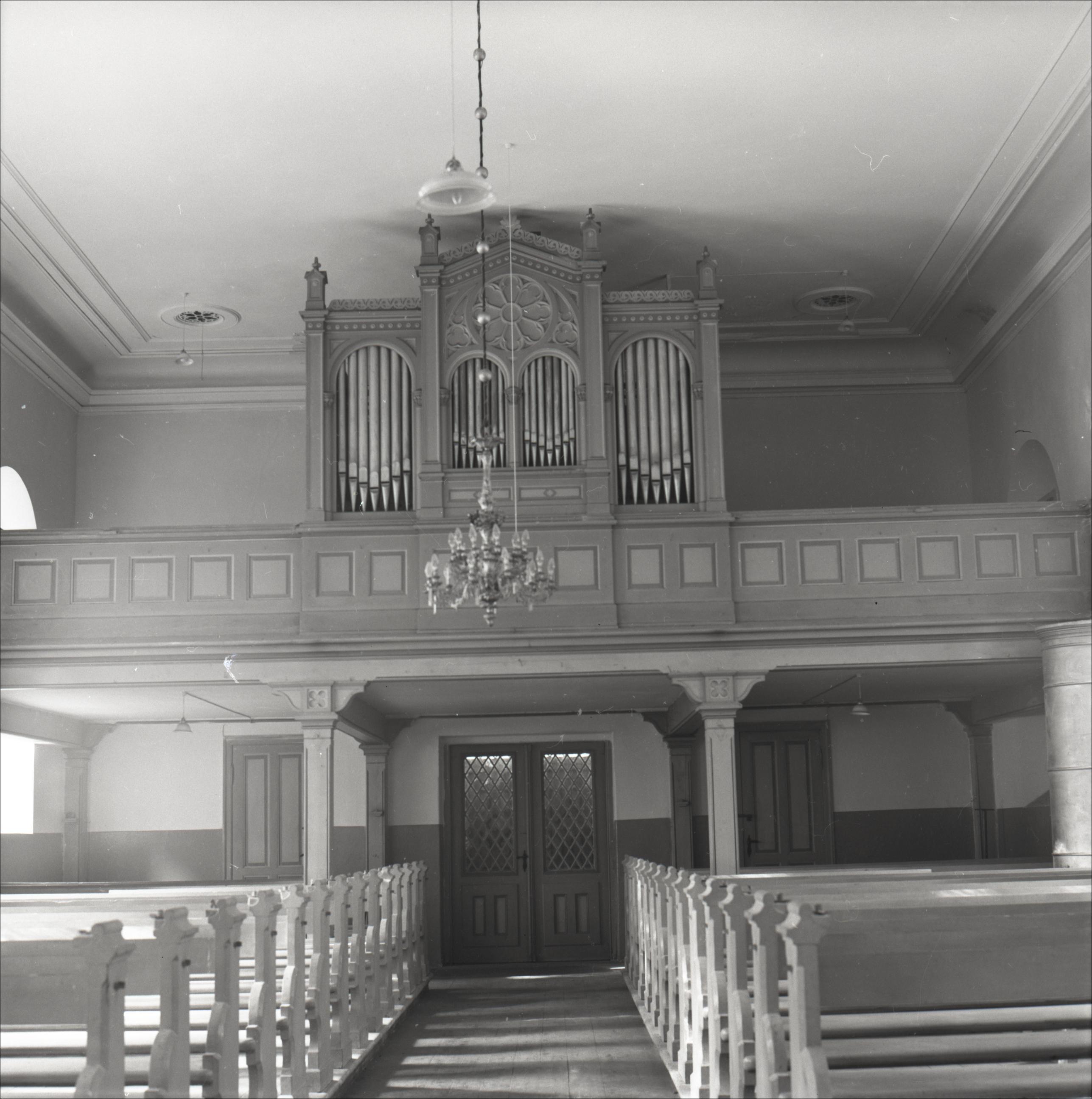 Salas Sv. Jāņa luterāņu baznīca: Skats uz ērģelēm uz balkona. Baznīcas koka soli divās rindās. No griestiem karājas lustra.