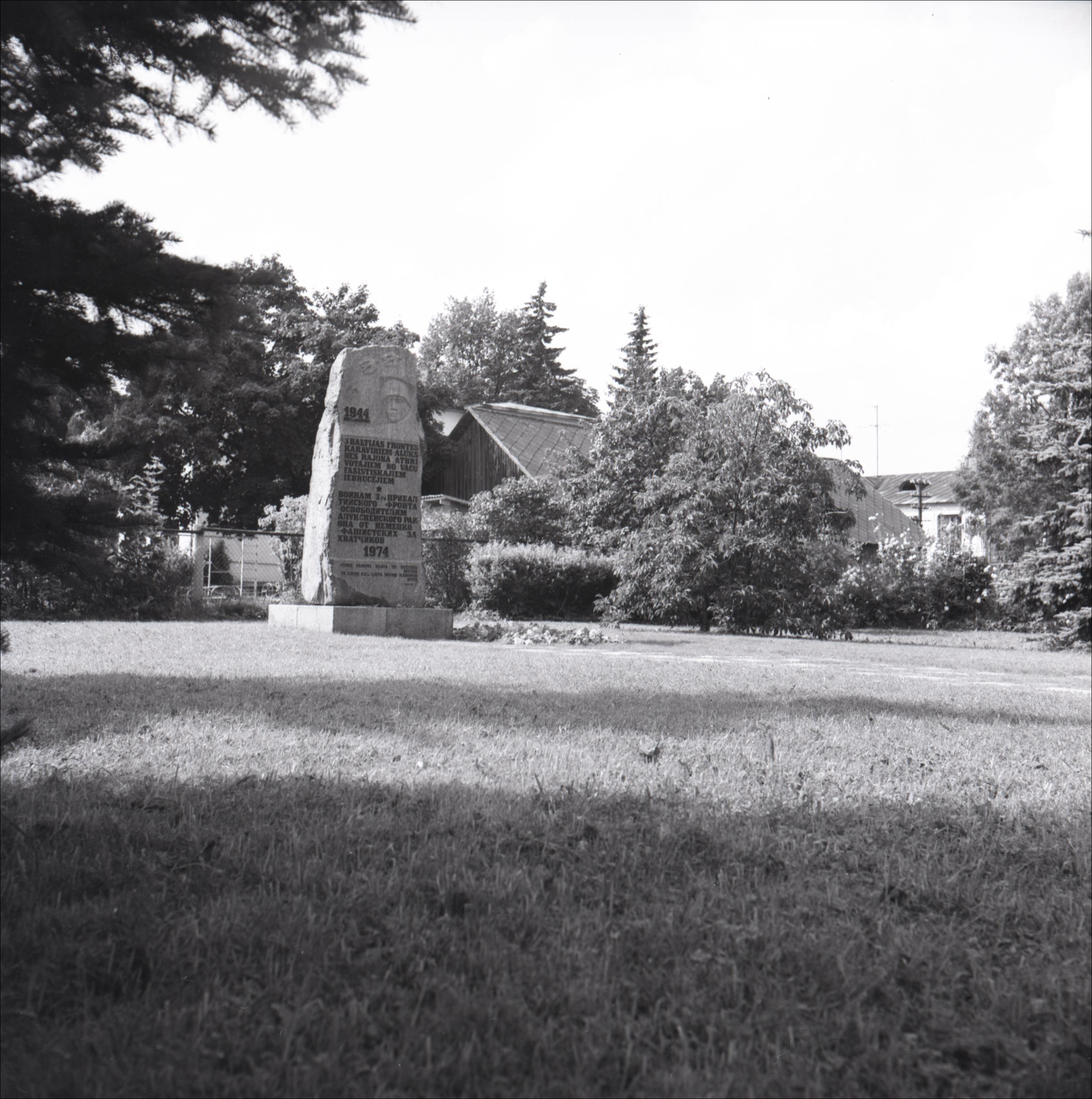 Piemiņas akmens: Piemiņas akmens Alūksnes rajona atbrīvotājiem. Skats no attāluma. Uz pieminekļa uzraksts latviešu un krievu valodās. Fonā koki, krūmi un ēkas.