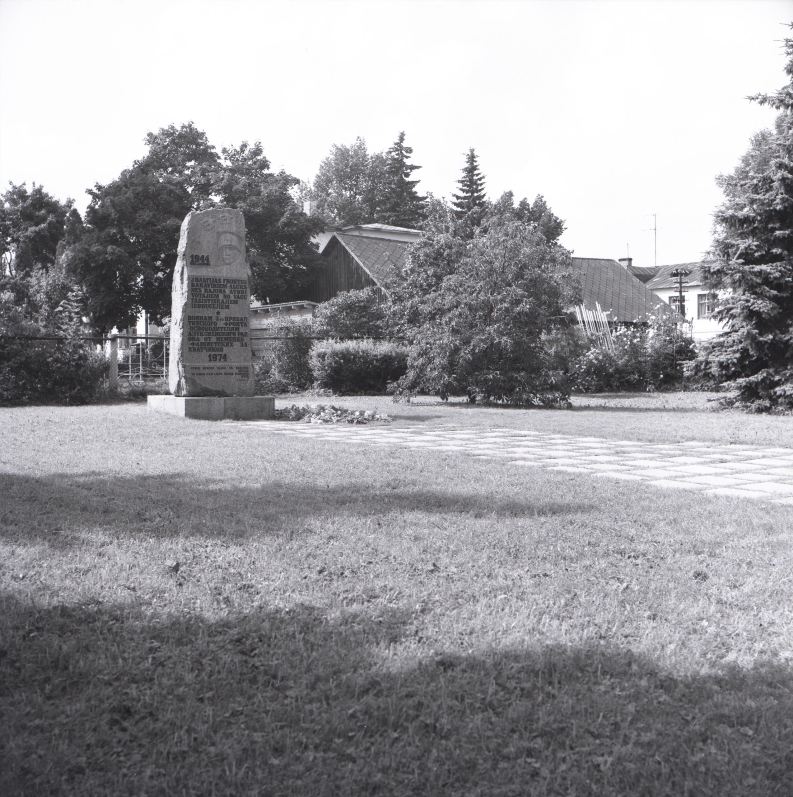 Piemiņas akmens: Piemiņas akmens Alūksnes rajona atbrīvotājiem. Skats no attāluma. Uz pieminekļa uzraksts latviešu un krievu valodās. Fonā koki, krūmi un ēkas.