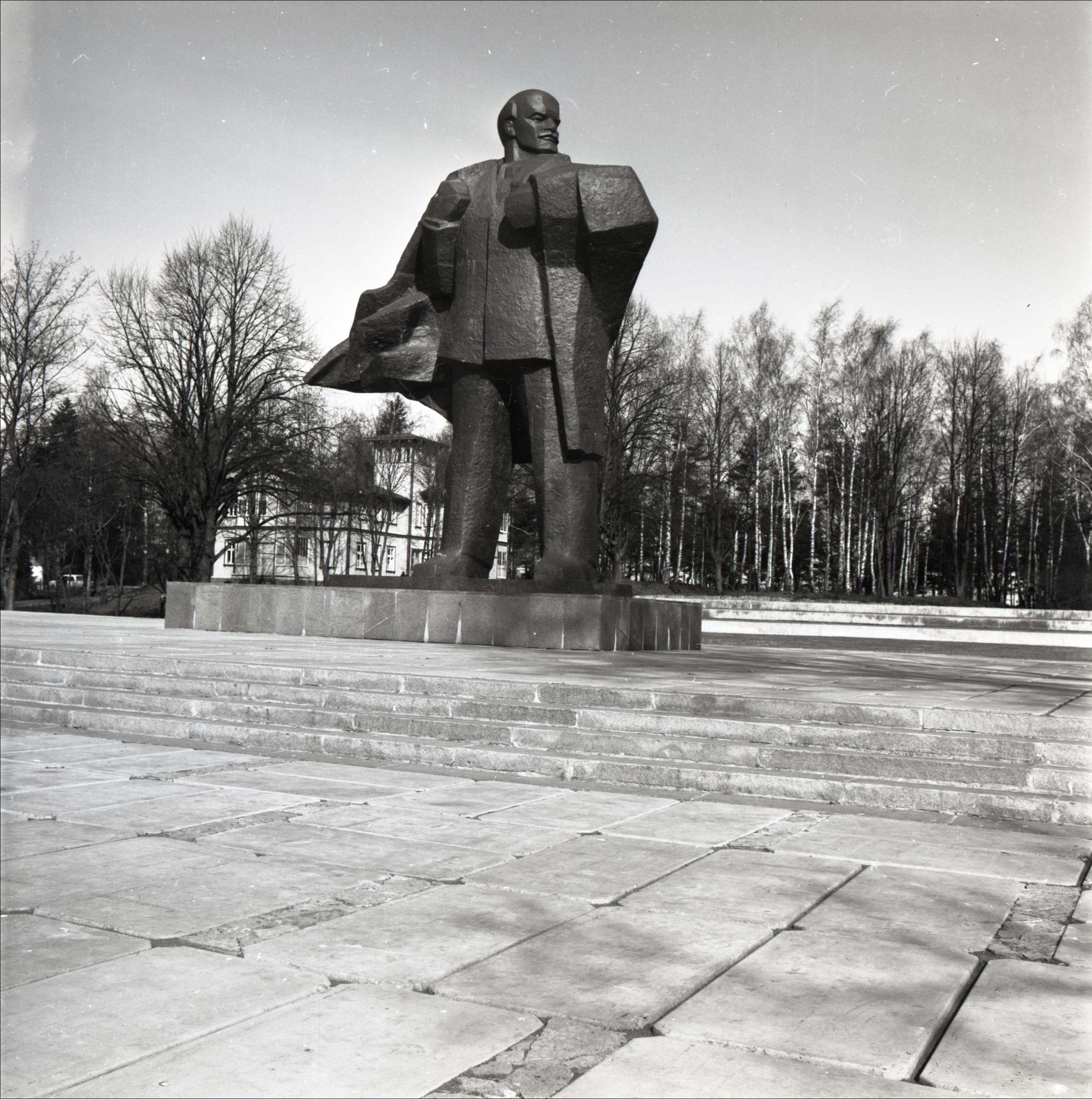 Piemineklis: Ļeņina piemineklis. Piemineklis uz neliela paaugstinājuma, uz pieminekli ved trepes. Atrodas bruģētā laukumā. Fonā koki un ēkas.