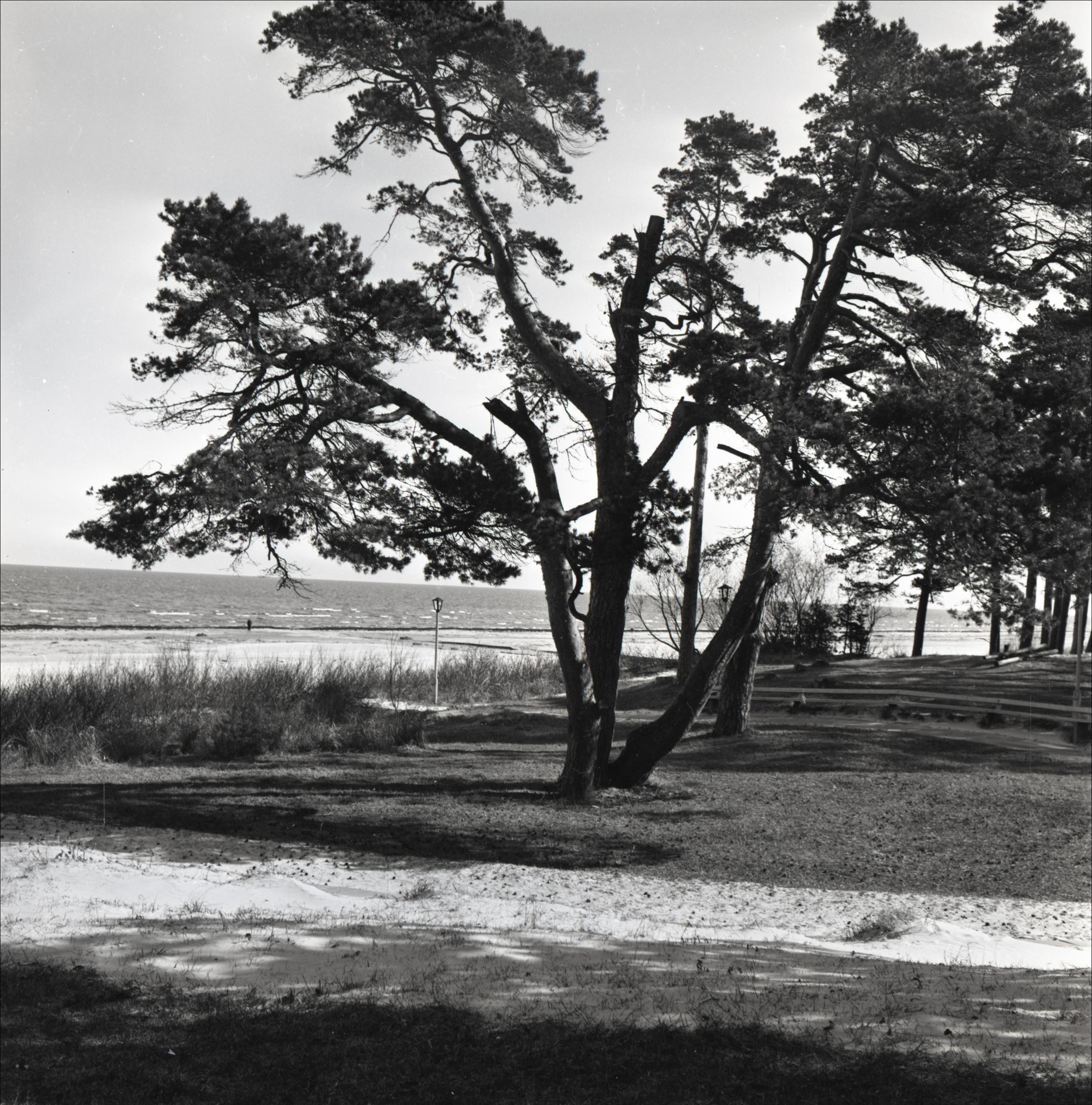 Raiņa priedes: Skatns no sāna. Blakus priedei redzams soliņš. Fonā jūra, laternas un citi koki uz kāpas.
