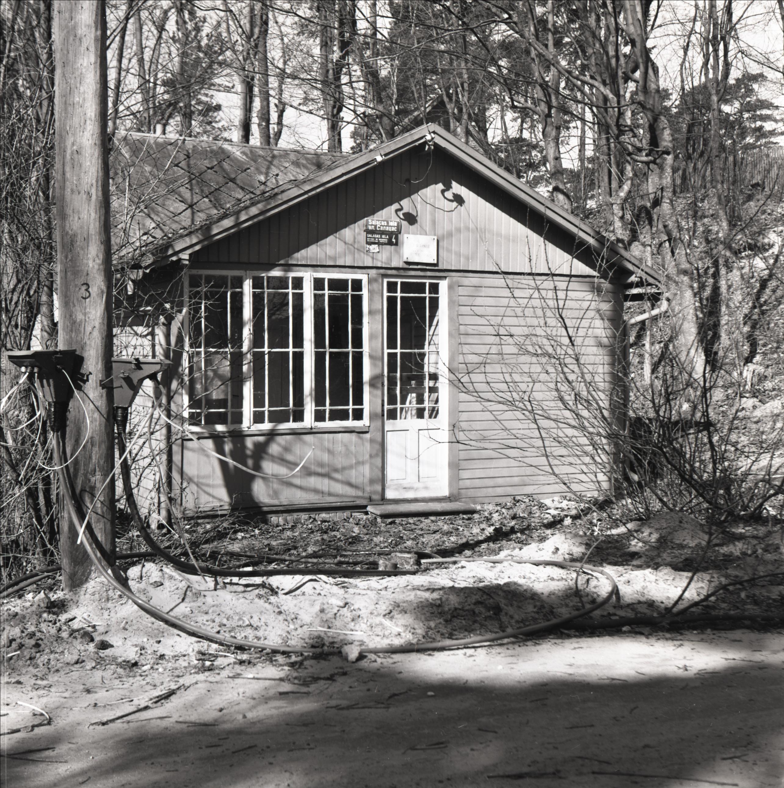 Ēka: Dzejnieku Raiņa un Aspazijas vasarnīca. Skats uz ēku no Salacas ielas puses uz ēkas ieejas fasādi, tuvplāns. Virs ieejas redzama piemiņas plāksne. Fonā pakalns ar kokiem.