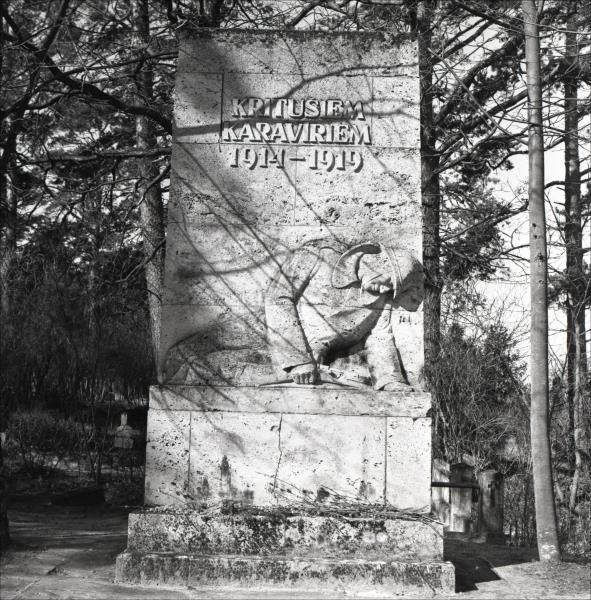 Asaru kapi: 1. pasaules kara kapi Asaru kapos. Pieminekļa tuvplāns. Piemineklis taisnstūra formā, uz tā cilnis ar uz zemes nokritušu karavīru, tam rokās ierocis.