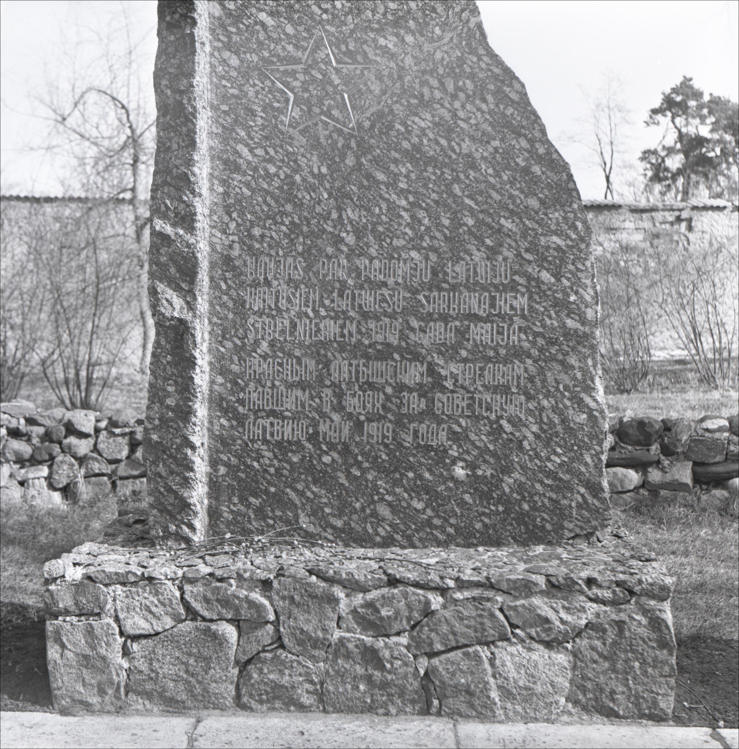 Brāļu kapi: 1919. gadā kritušo latviešu sarkano strēlnieku kapi. Pieminekļa tuvplāns. Uz pieminekļa iegravēts teksts latviešu un krievu valodās, virs teksta piecstaru zvaigzne. Piemineklis atrodas uz mūrēta akmens paaugstinājuma, aiz pieminekļa redzama sakrautu akmeņu apmale, fonā mūrēta siena