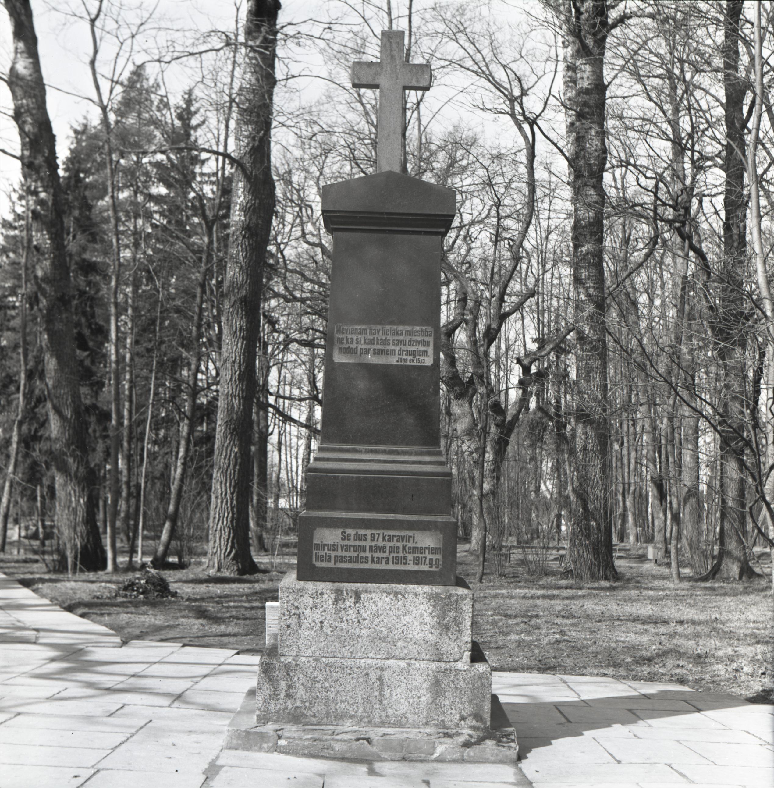 1. pasaules kara kapi Ķemeru parkā: 1. pasaules kara 97 brāļu kapi pie Ķemeru pareizticīgo baznīcas Ķemeru parkā. Piemineklis, pieminekļa galā krusts. Uz pieminekļa uzraksti latviešu valodā. Fonā ķemeru parks.