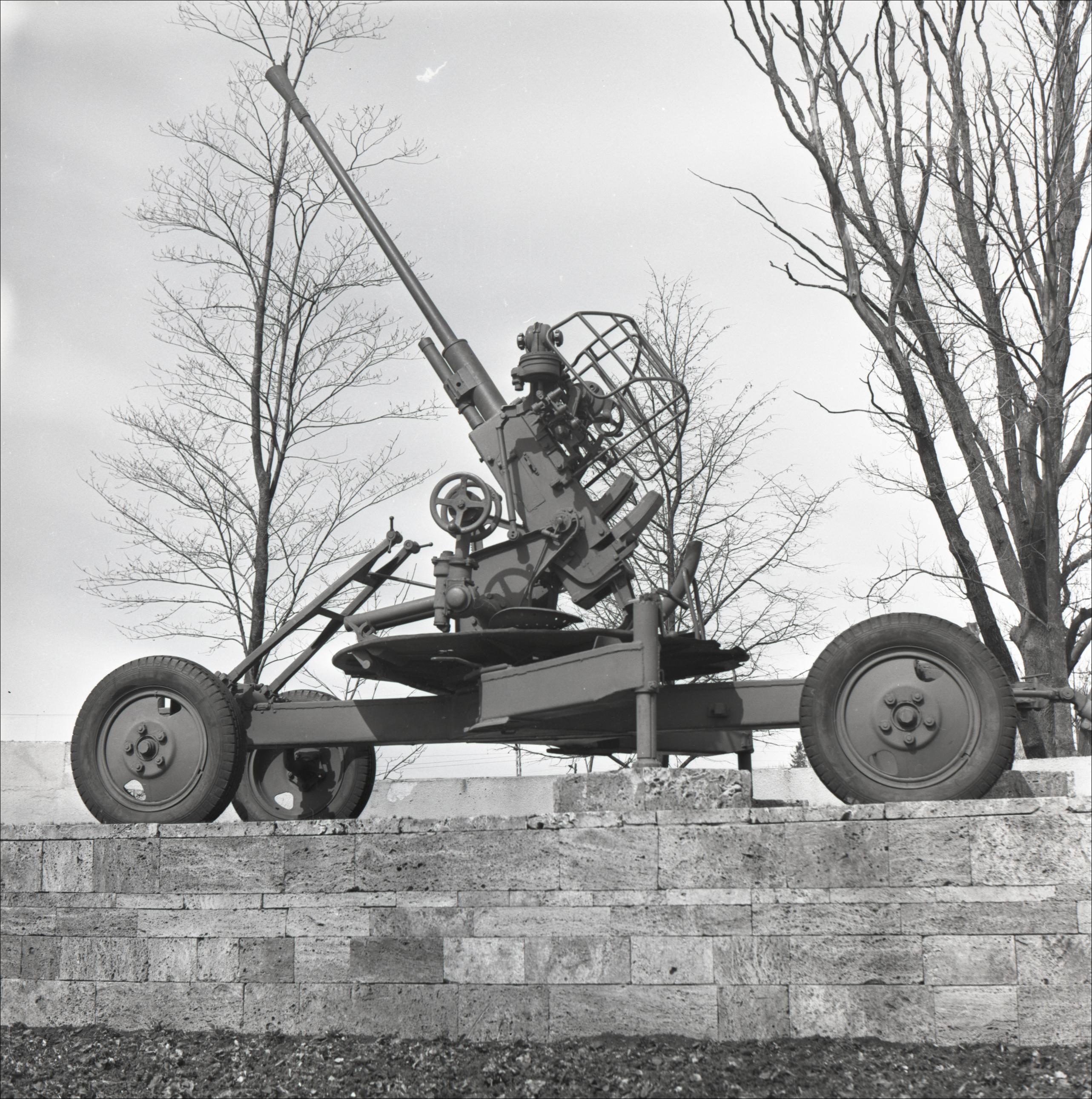 Lielgabals: Piemineklis - zenītlielgabals. Tuvplāns. Lielgabals atrodas uz mūrēta paaugstinājuma. Fonā koki.