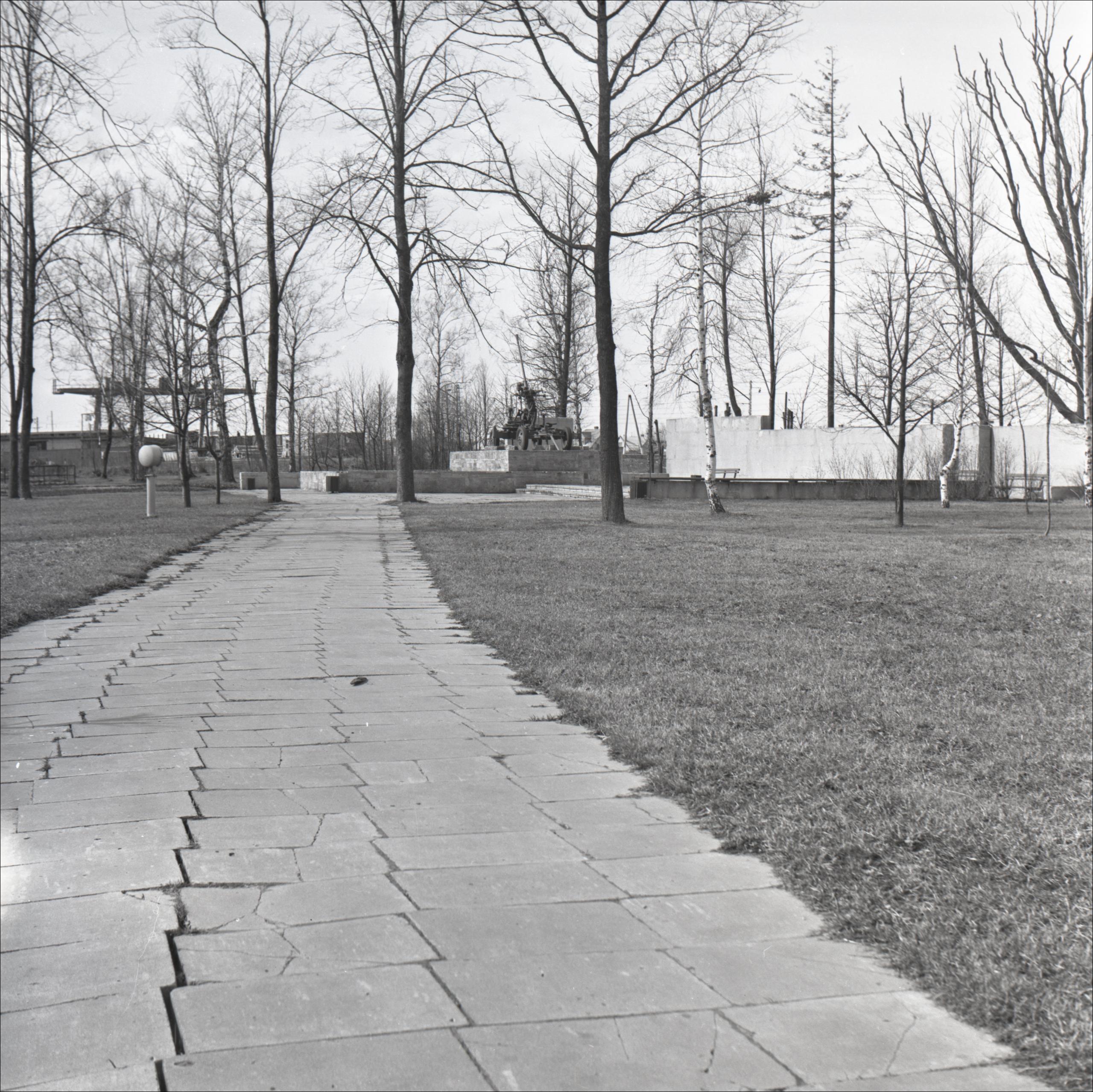 Lielgabals: Piemineklis - zenītlielgabals. Skats uz pieminekli no attāluma. Lielgabals atrodas uz mūrēta paaugstinājuma. Uz pieminekli ved bruģēts ceļš, ap pieminekli bruģēts laukums, redzami soliņi un mūrētas sienas. Fonā koki.