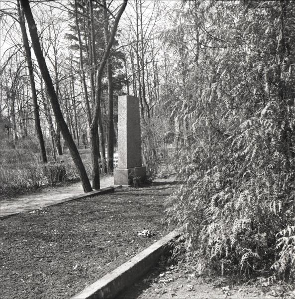 Slokas pareizticīgo kapi: Fašisma terora upuru kapi. Piemineklis. Skats no atstatuma. Fonā citi kapi un koki.