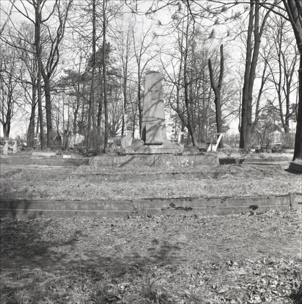 Slokas luterāņu kapi: 1. pasaules kara kapi Slokas kapu luterāņu sektorā. Skats uz piemineklis - obelisku no atstatuma. Obeliska augšējā daļā krusts. Lejas daļā no betona liets dekoratīvs papīra rullis. Piemineklis atrodas uz vairākiem paaugstinājumiem. Fonā citi kapi un koki.
