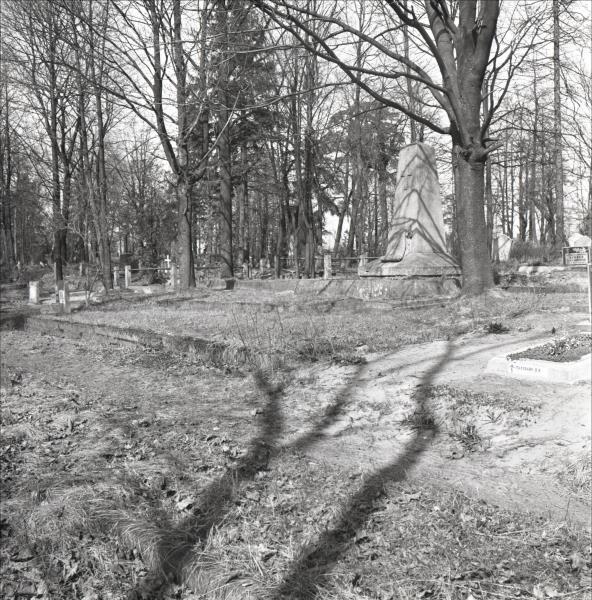 Slokas luterāņu kapi: 1. pasaules kara kapi Slokas kapu luterāņu sektorā. Skats uz piemineklis - obelisku no atstatuma. Obeliska augšējā daļā krusts. Lejas daļā no betona liets dekoratīvs papīra rullis. Piemineklis atrodas uz vairākiem paaugstinājumiem. Fonā citi kapi un koki.