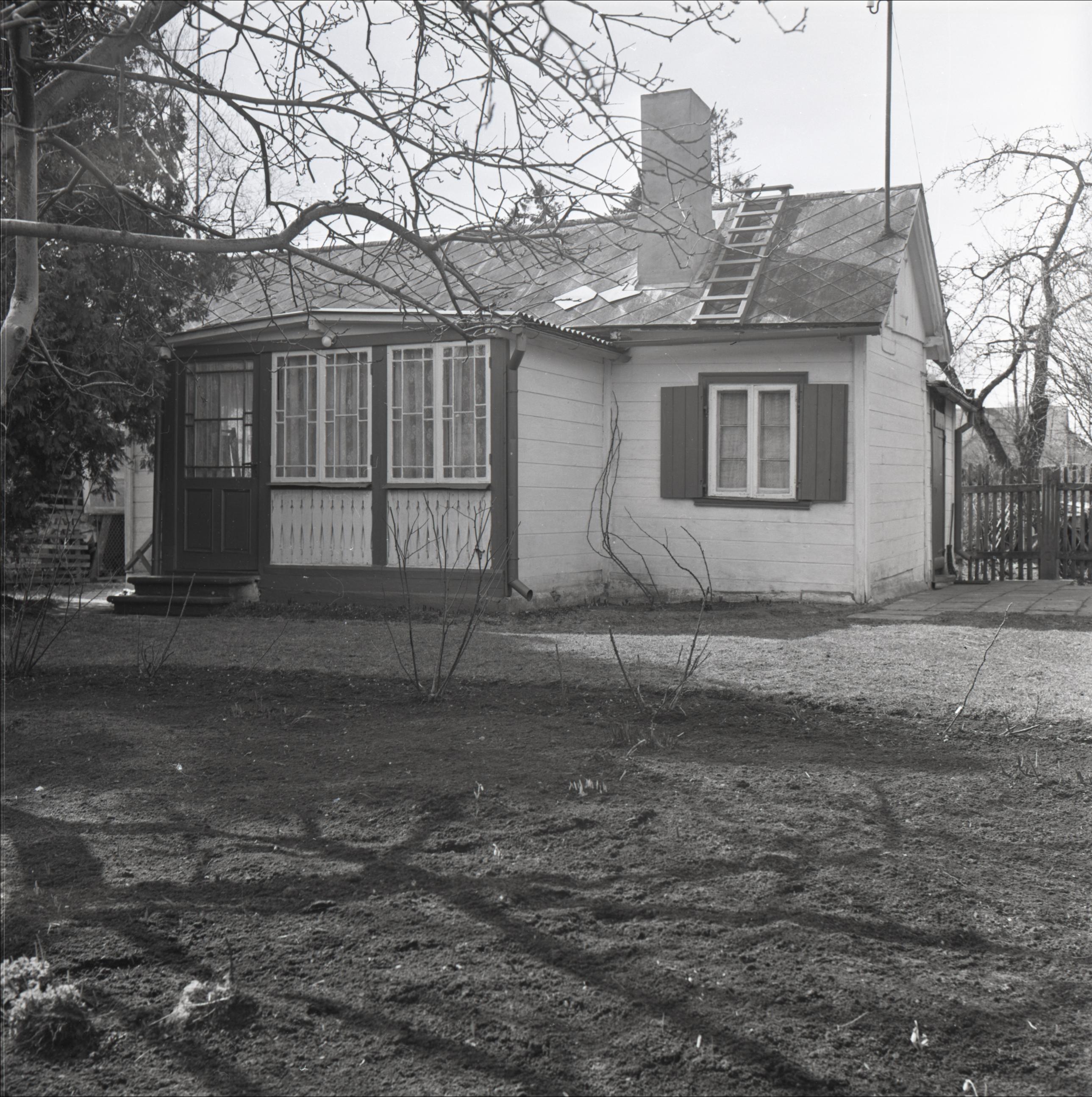 Ēka: Koka ēka ar divslīpju jumtu. Pie ēkas lievenis ar stikla rūtīm. Aiz mājas redzams koka žogs.