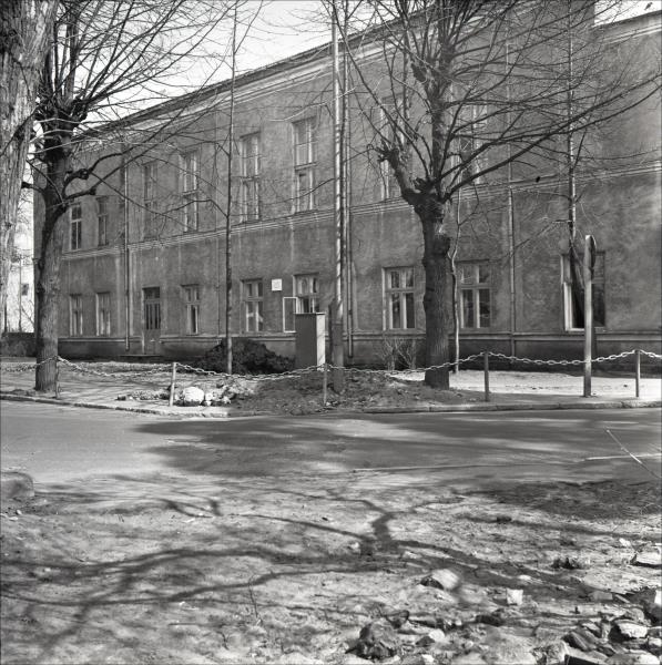 Ēka: Majoru skola. Skats uz ēkas galveno fasādi. Ap ēku nožogojums ar metāla stabiņiem un metāla ķēdi starp tiem. Pie fasādes redzama piemiņas plāksne.