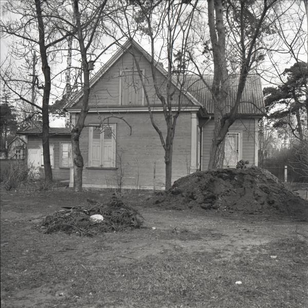 Ēka: Ēka, kurā 1906. gadā notika LSDSP III un LSD I kongress. Skats uz ēku no pagalma puses. Ēkai priekšā zemes kaudze un koki. Fonā citas ēkas.