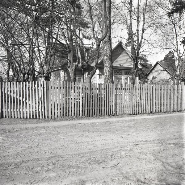 Ēka: Ēka, kurā 1906. gadā notika LSDSP III un LSD I kongress. Skats uz ēku no ielas puses. Starp ēkas teritoriju un ielu koka žogs, skatu uz ēku daļēji aizsedz koki un žoks. Fonā citas ēkas.
