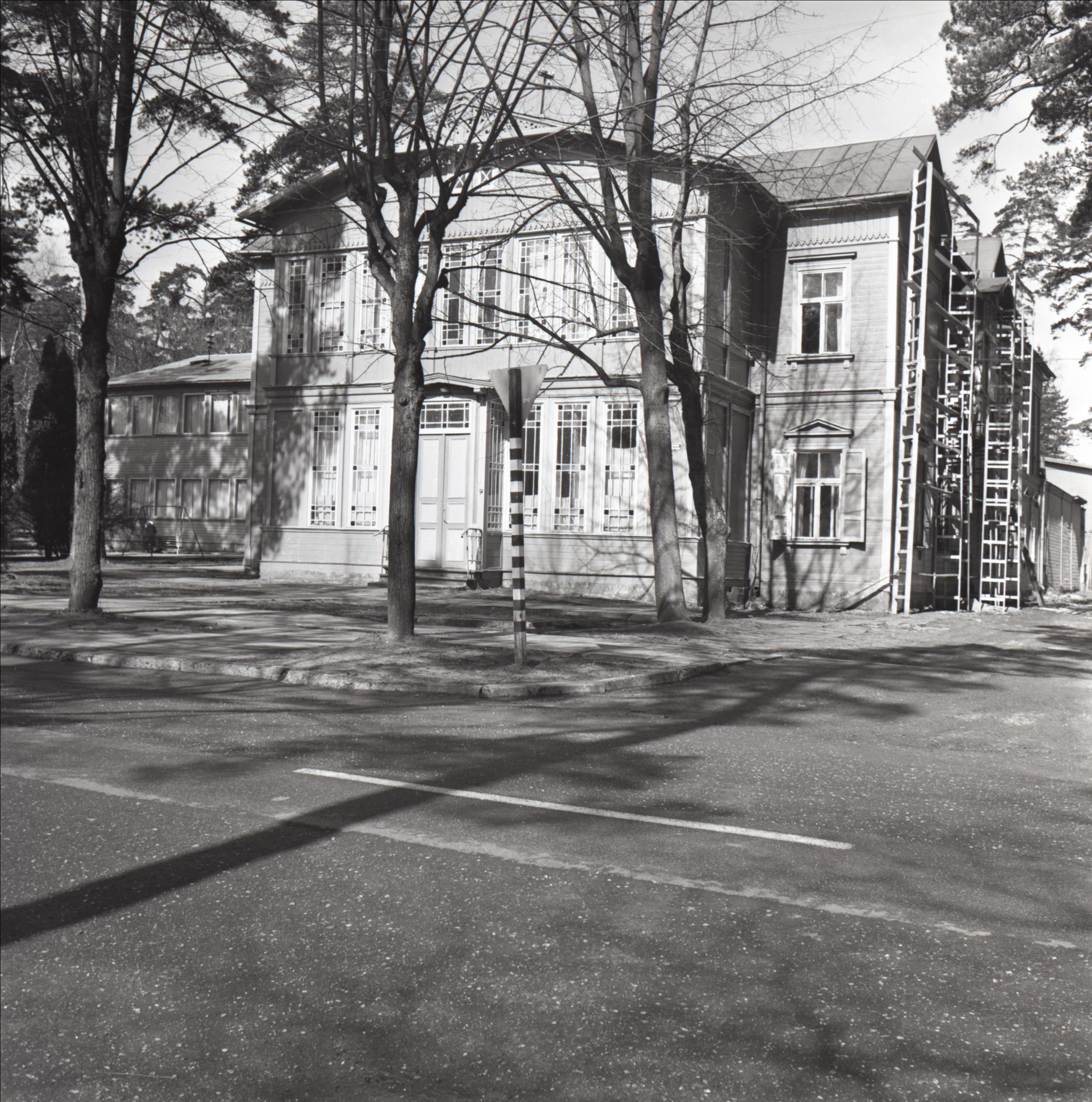 Ēka: Ēka, kurā 1905. gadā dzīvojis rakstnieks Maksims Gorkijs. Skats uz ēku no ielas otras puses. Divstāvu ēka, pie vienas no fasādēm redzamas stalažas. Skatu uz ēku daļēji aizsedz koki, fonā redzama cita ēka.
