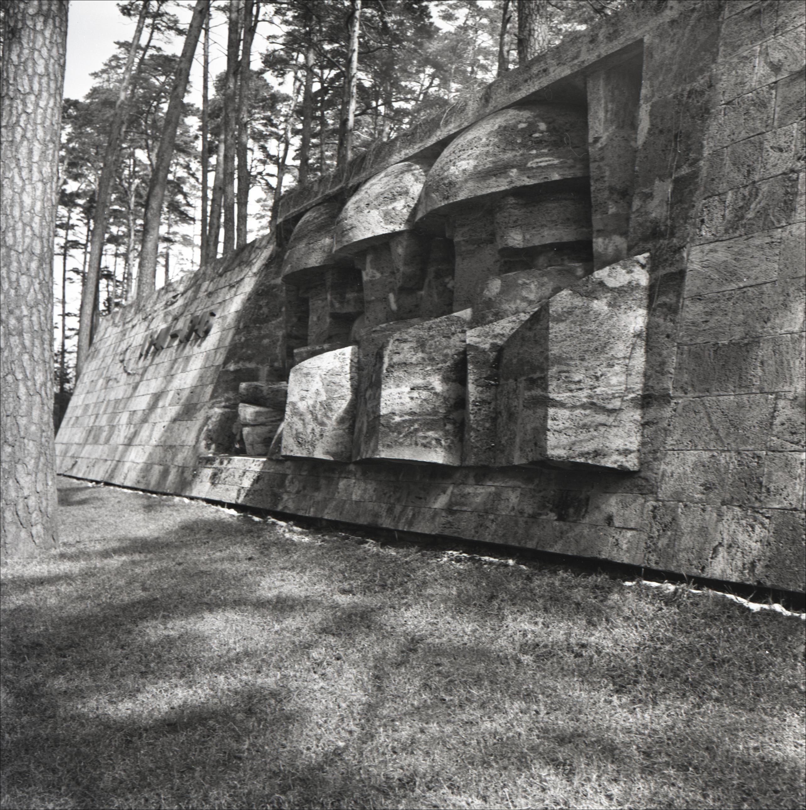 2. pasaules kara brāļu kapi.: Skulpturāla šūnakmens siena ar cilni, kurā attēloti 3 karavīri profilā. Uz sienas gadskaitļi: 1941–1945. Fonā koki