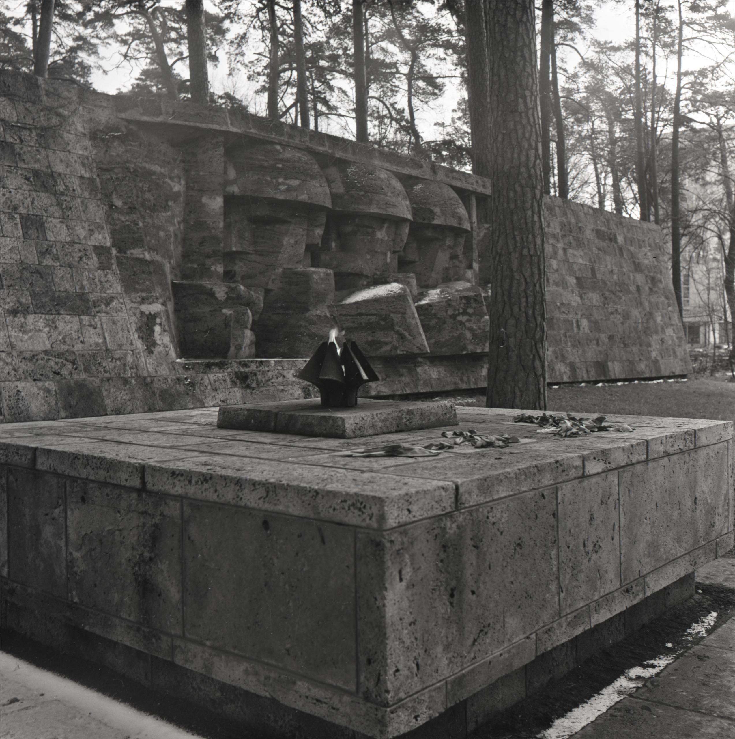 2. pasaules kara brāļu kapi.: Skulpturāla šūnakmens siena ar cilni, kurā attēloti 3 karavīri profilā. Pie sienas šūnakmens paaugstinājumu, uz kura atrodas degoša lāpa. Fonā koki un ēka.