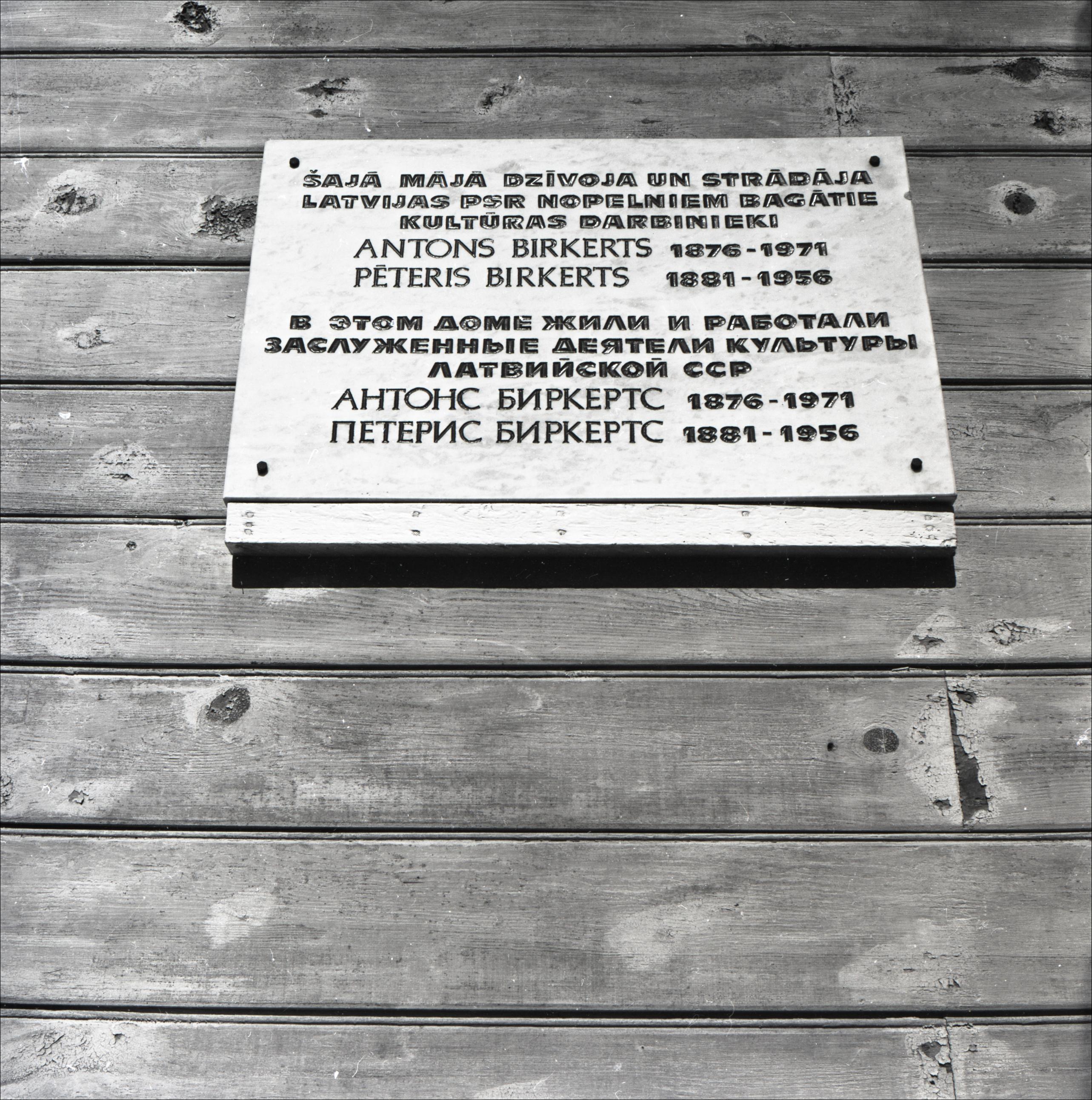 Ēka: Ēka, kurā dzīvoja Antons Birkerts un Pēteris Birkerts. Piemiņas plāksnes tuvplāns. Uz piemiņas plāksnes uzraksts latviešu un krievu valodās.