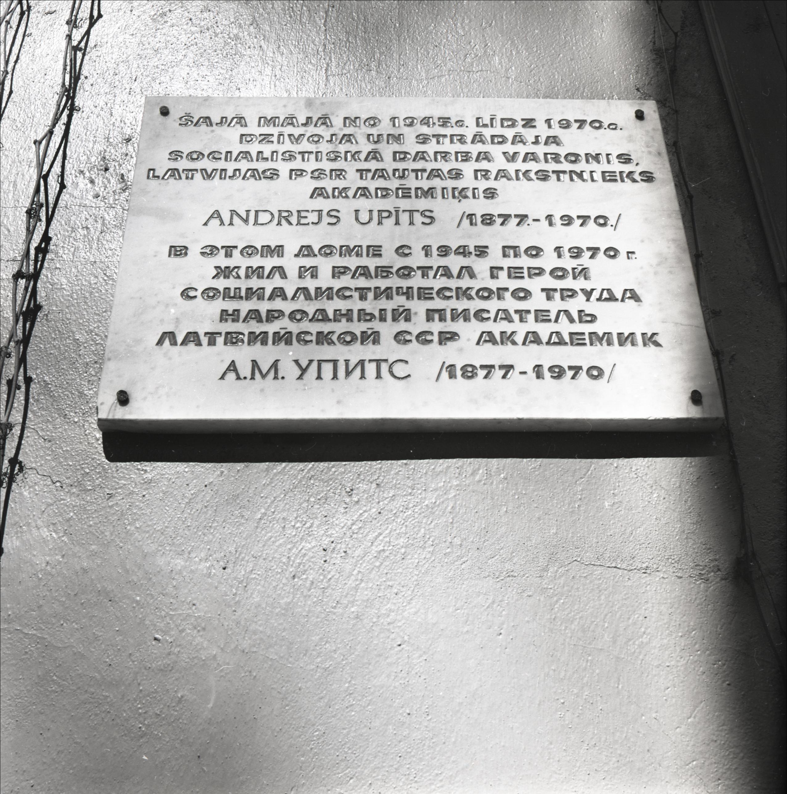 Ēka: Ēka, kurā dzīvoja rakstnieks Andrejs Upīts. Piemiņas plāksnes tuvplāns. Uz plāksnes uzraksti latviešu un krievu valodās.