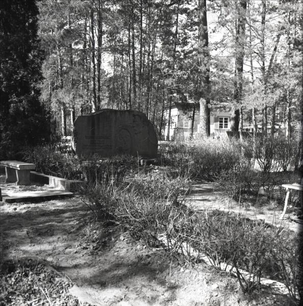Lielupes kapi: Ernesta Birznieka - Upīša kaps un piemineklis. Skats no atstatuma. Granīta piemineklis, pieminekļa labajā pusē cilnis ar vīrieša, sievietes un bērna sejām. Kreisajā pusē dzīves dati. Apkārt kapa vietai dzīvžogs. Fonā koki un ēka