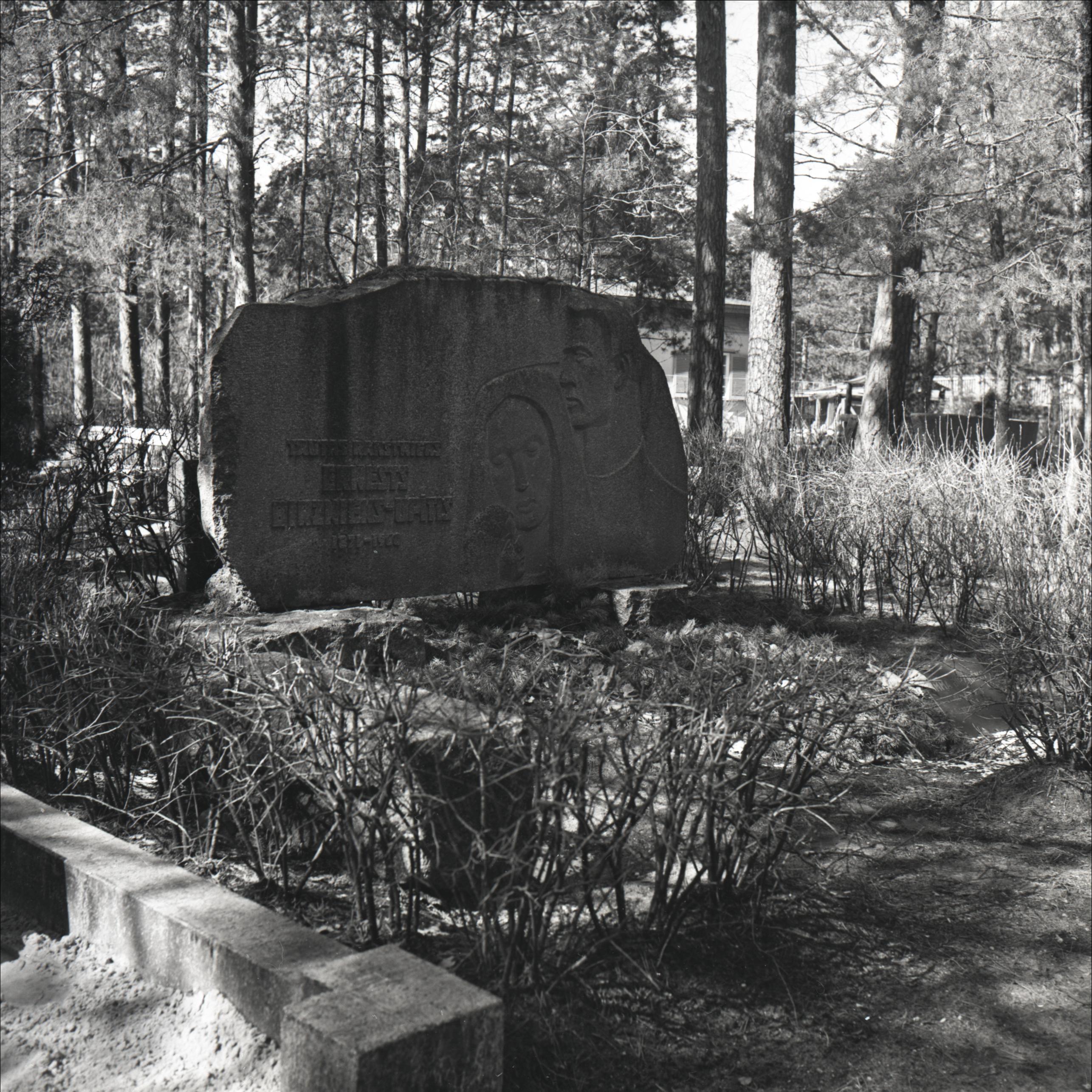 Lielupes kapi: Ernesta Birznieka - Upīša kaps un piemineklis. Skats no atstatuma. Granīta piemineklis, pieminekļa labajā pusē cilnis ar vīrieša, sievietes un bērna sejām. Kreisajā pusē dzīves dati. Apkārt kapa vietai dzīvžogs. Fonā koki un ēka