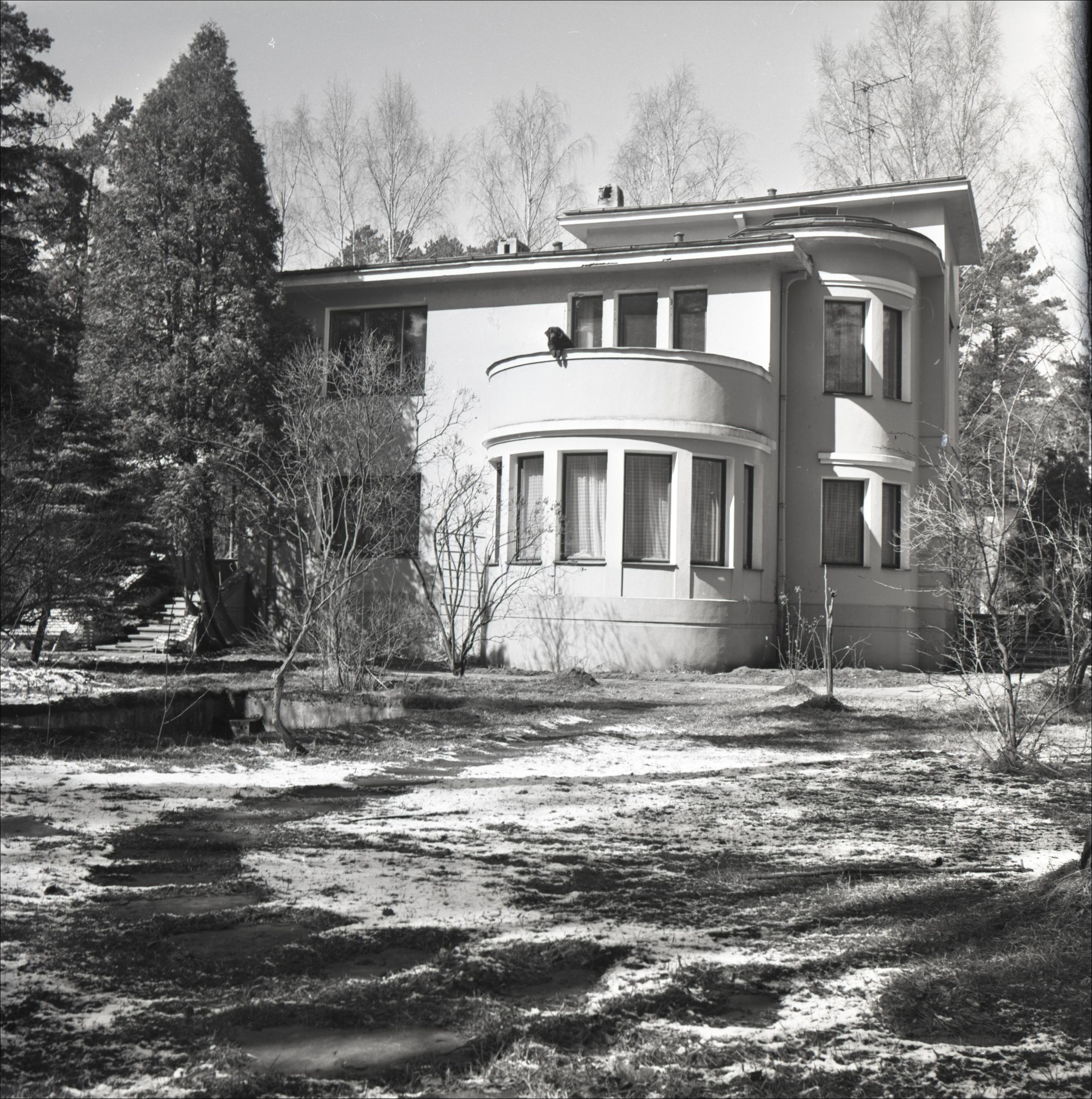 Ēka: Ēka, kurā dzīvojis Arnolds Deglavs. Skats uz ēku no pagalma puses. Divstāvu ēka, no fasādes lokveida izvirzījums, otrajā stāvā balkons. Pāri balkona malai redzams suns. Pie ēkas izbetonēta baseina vieta.