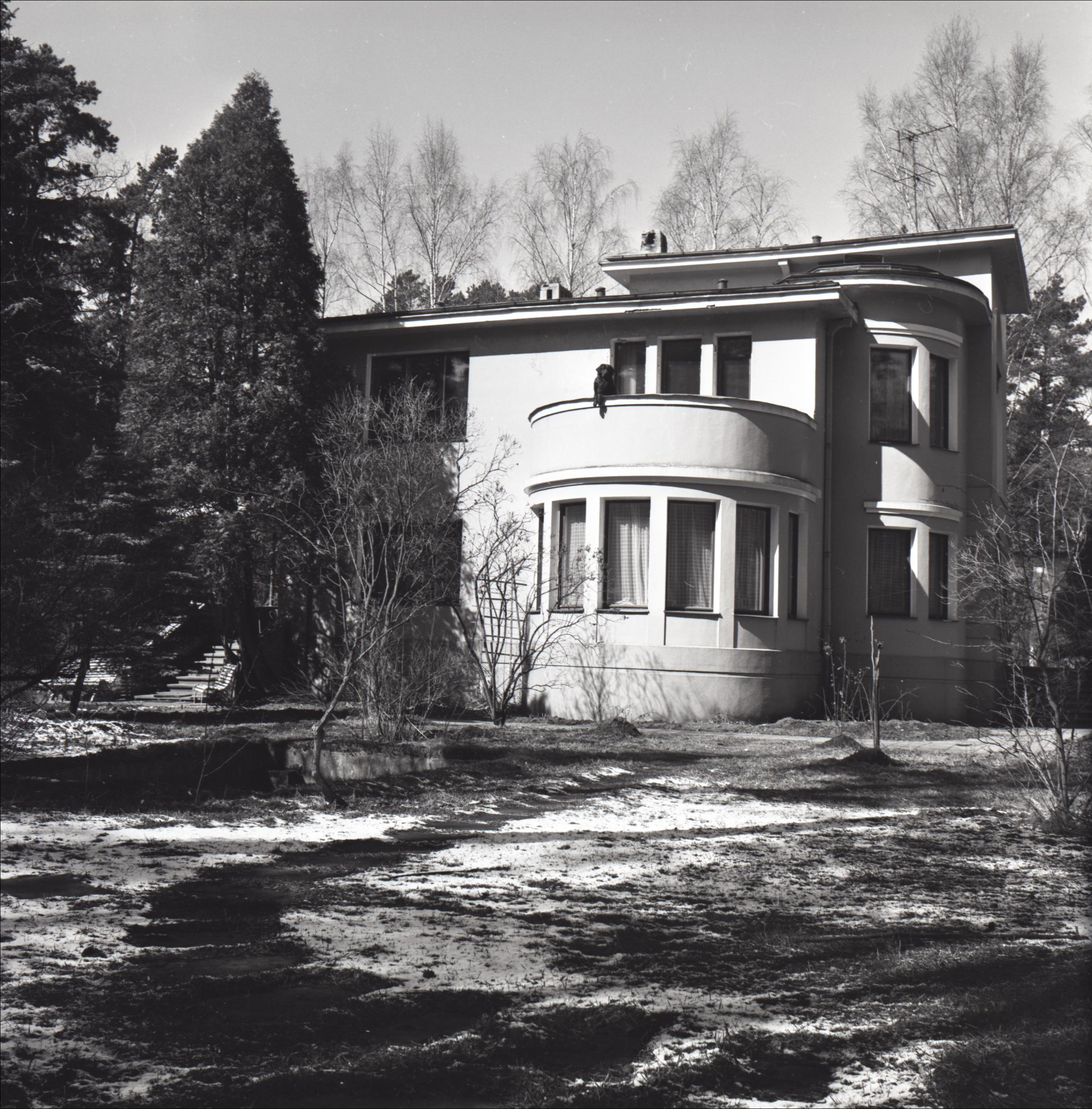 Ēka: Ēka, kurā dzīvojis Arnolds Deglavs. Skats uz ēku no pagalma puses. Divstāvu ēka, no fasādes lokveida izvirzījums, otrajā stāvā balkons. Pāri balkona malai redzams suns. Pie ēkas izbetonēta baseina vieta.