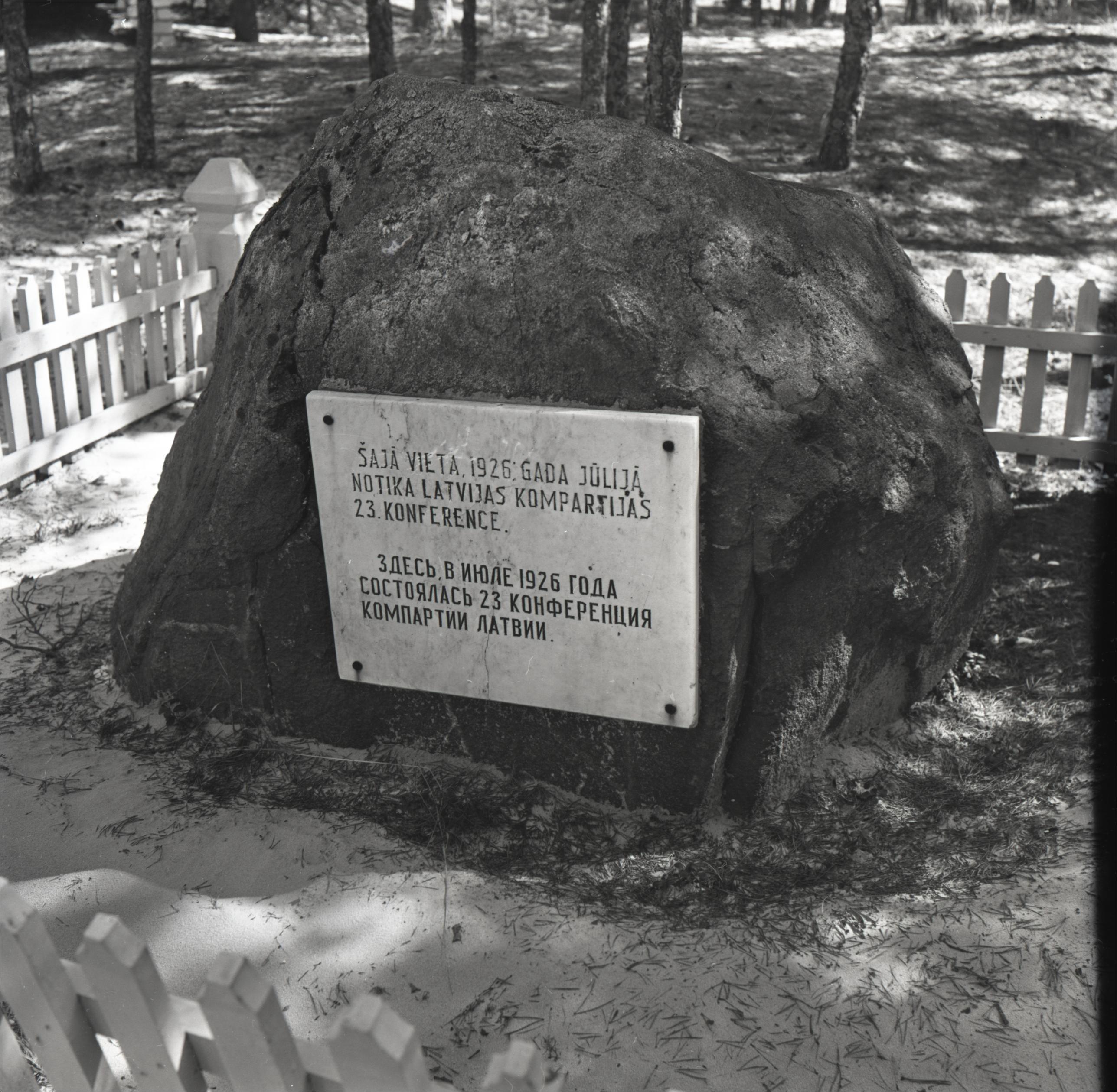 Piemiņas akmens: Piemiņas akmens vietā, kur 1926. gadā notika Latvijas komunistiskās partijas 23. konference. Piemiņas akmens tuvplāns. Pie akmens balta marmora plāksne, uz tās uzraksts latviešu un krievu valodās. Ap akmeni koka iežogojums. Fonā koki.