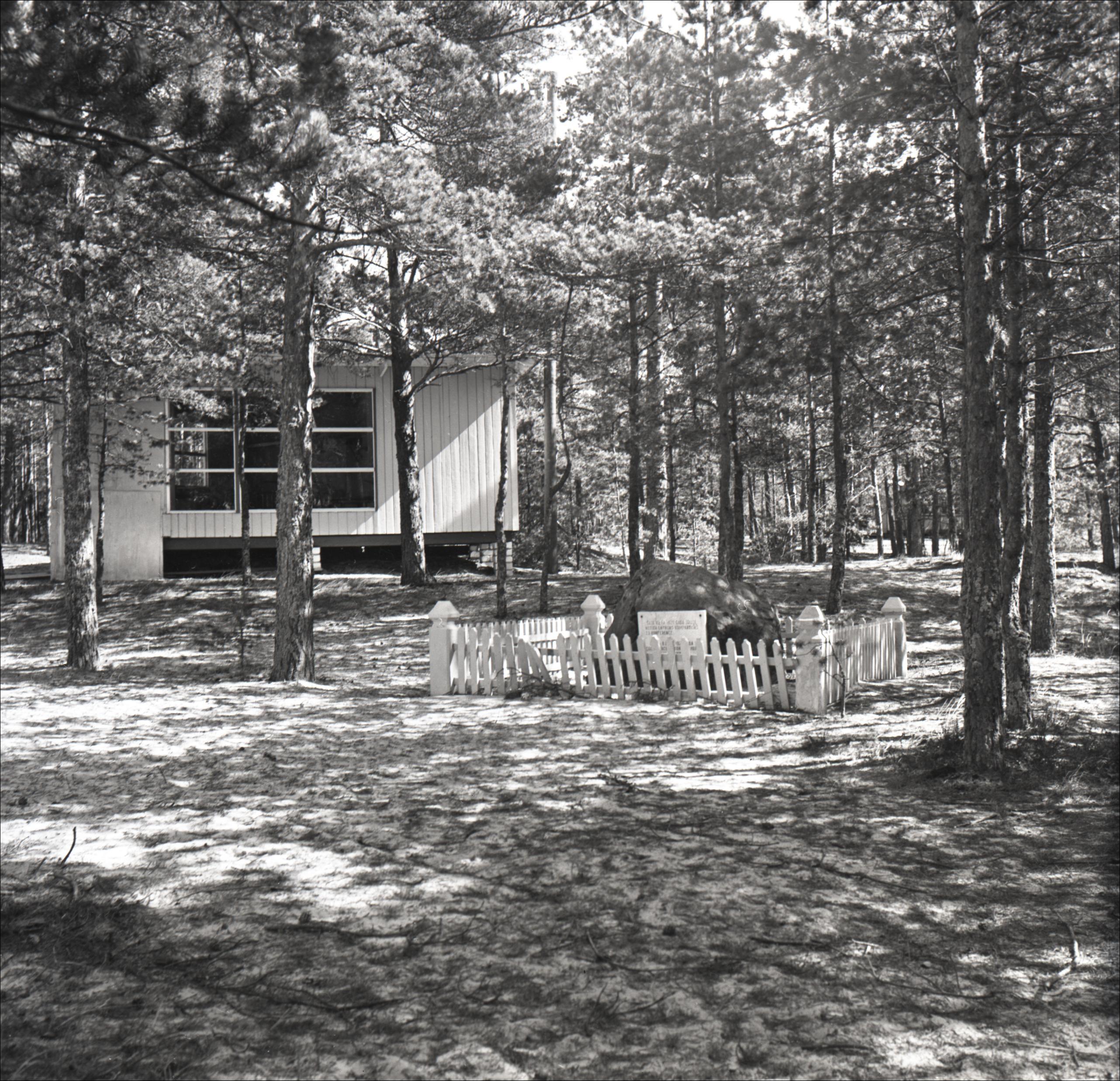 Piemiņas akmens: Piemiņas akmens vietā, kur 1926. gadā notika Latvijas komunistiskās partijas 23. konference. Skats no attāluma Pie akmens balta marmora plāksne. Ap akmeni koka iežogojums. Fonā ēka un koki.