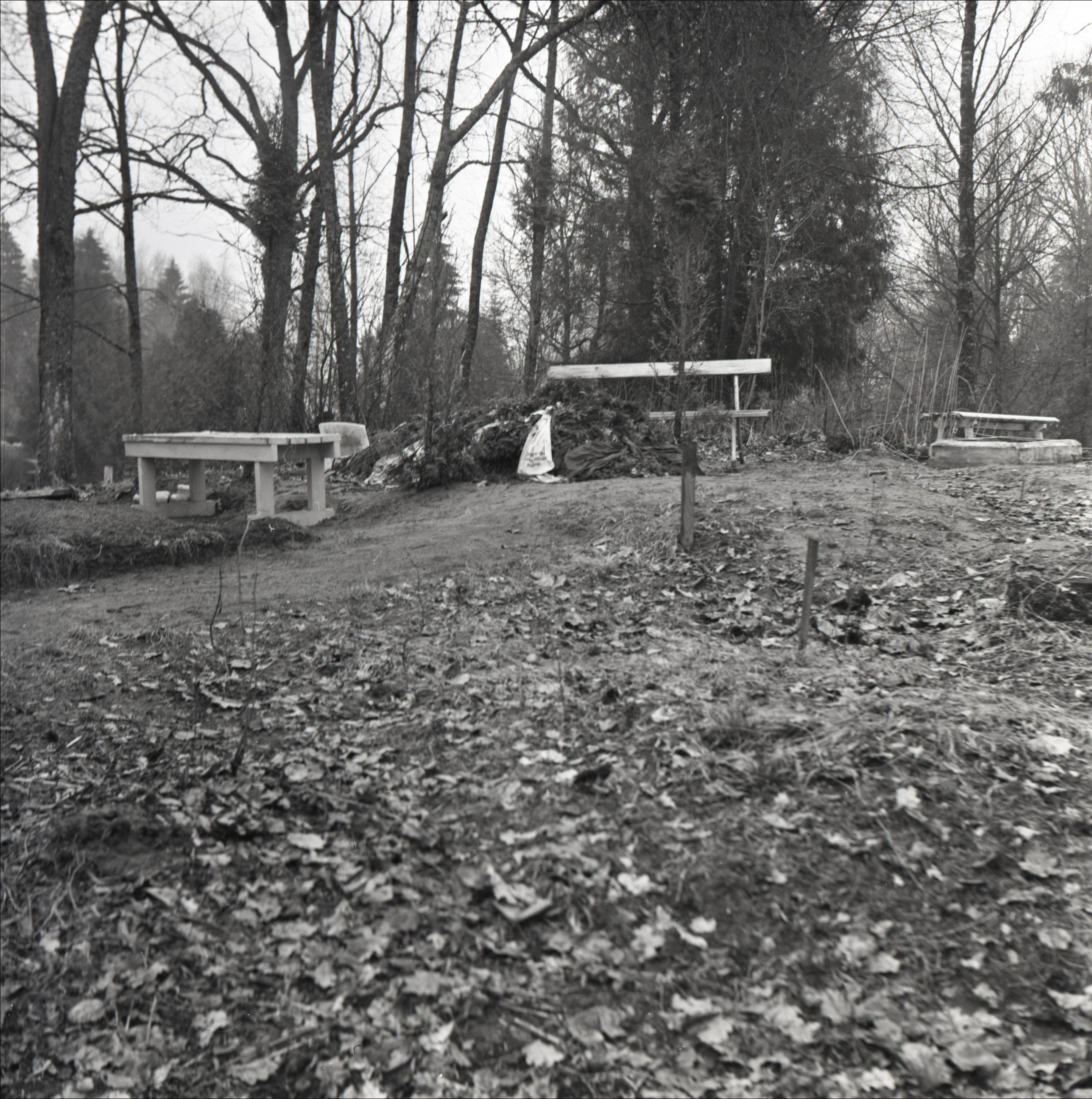 Madlienas kapi: Jāņa Ezeriņa kaps. Skats no atstatuma. Kaps aplikts ar eģļu zariem. Uz kapa balta lenta. Abpus kapam soliņi.